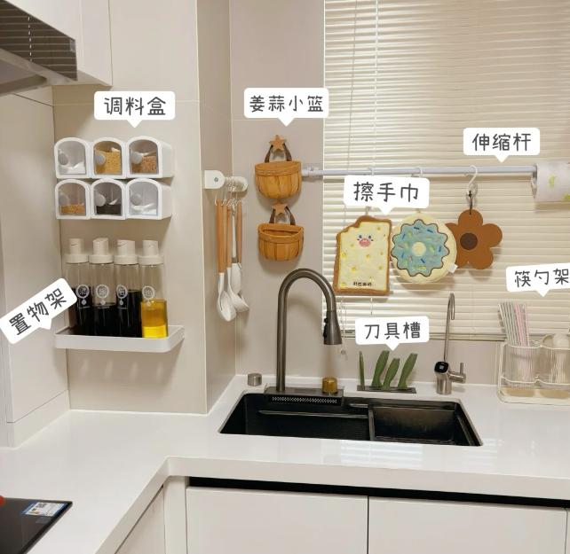 这里是我们经常做饭的地方,无疑会添置各种各样的东西,比如,调料、大型家电、锅具等等,若是全部都堆积在台面或者角落中,肯定会乱糟糟的。