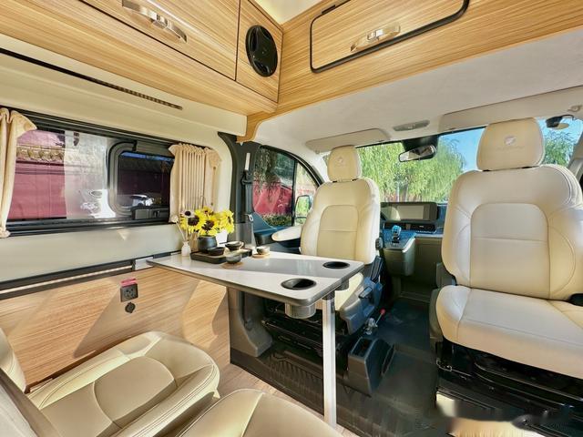 进入车内,整车核载4人,副驾驶能进行180度旋转,就拥有了一个小型会客厅,中排为两张汽车商务座椅,外侧座椅还能进行侧滑,这下空间就更宽敞了。