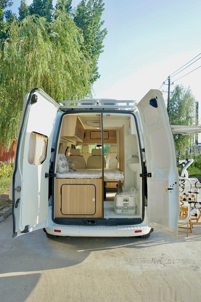 将后门打开,能使整车的空间更加通透,还可以给车内进行通风换气,躺在固定床上可以零距离接触大自然,如果担心蚊虫,可以在后方加一个纱门。