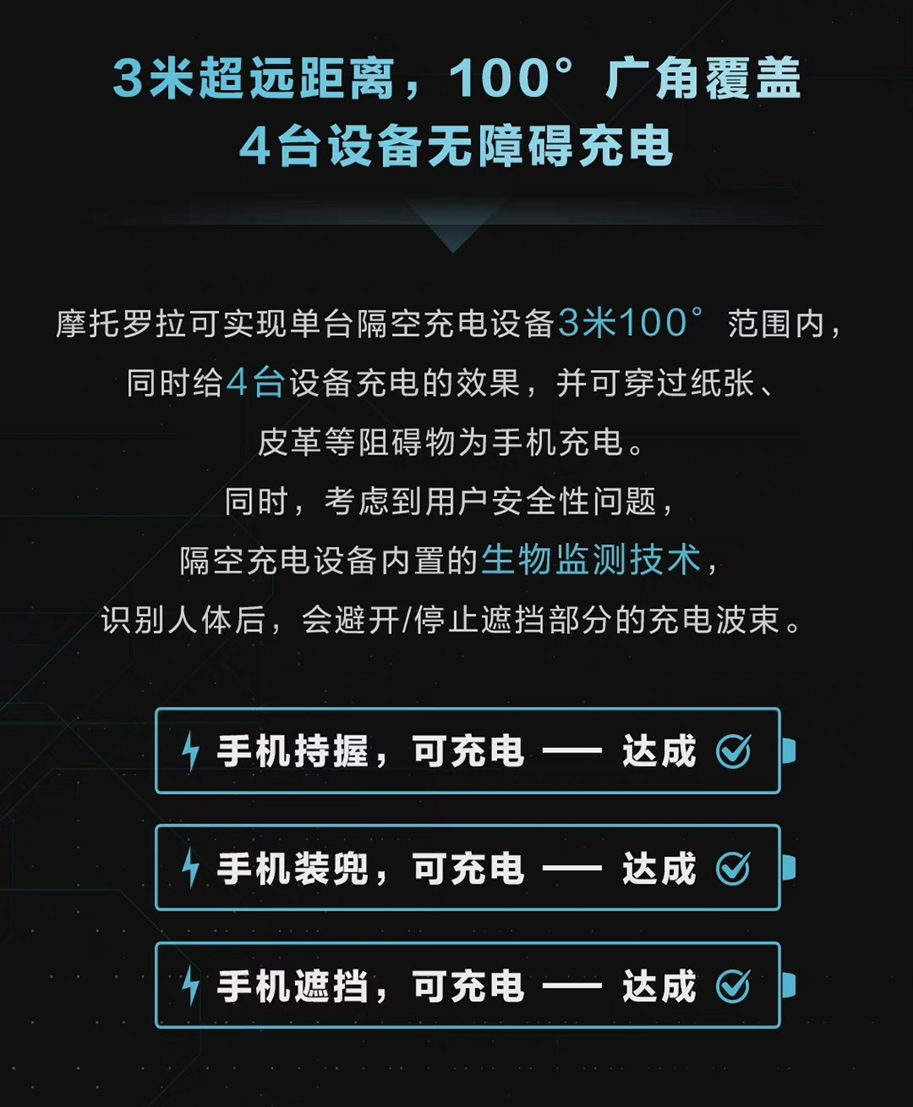 在微博上分享的演示视频中,摩托罗拉展示了其第二代无线充电解决方案,即使有障碍物,它现在也可以为设备充电。摩托罗拉的第二代无线充电器比之前的型号有了很大的进步,它甚至胜过了小米和OPPO的类似解决方案。小米的Mi Air Charge技术和OPPO的无线Air Charge技术一次只能为一台设备充电。虽然小米的解决方案可以为几米外的设备提供 5W 功率充电,但 OPPO 解决方案仅在设备距离其表面10 厘米才有效。