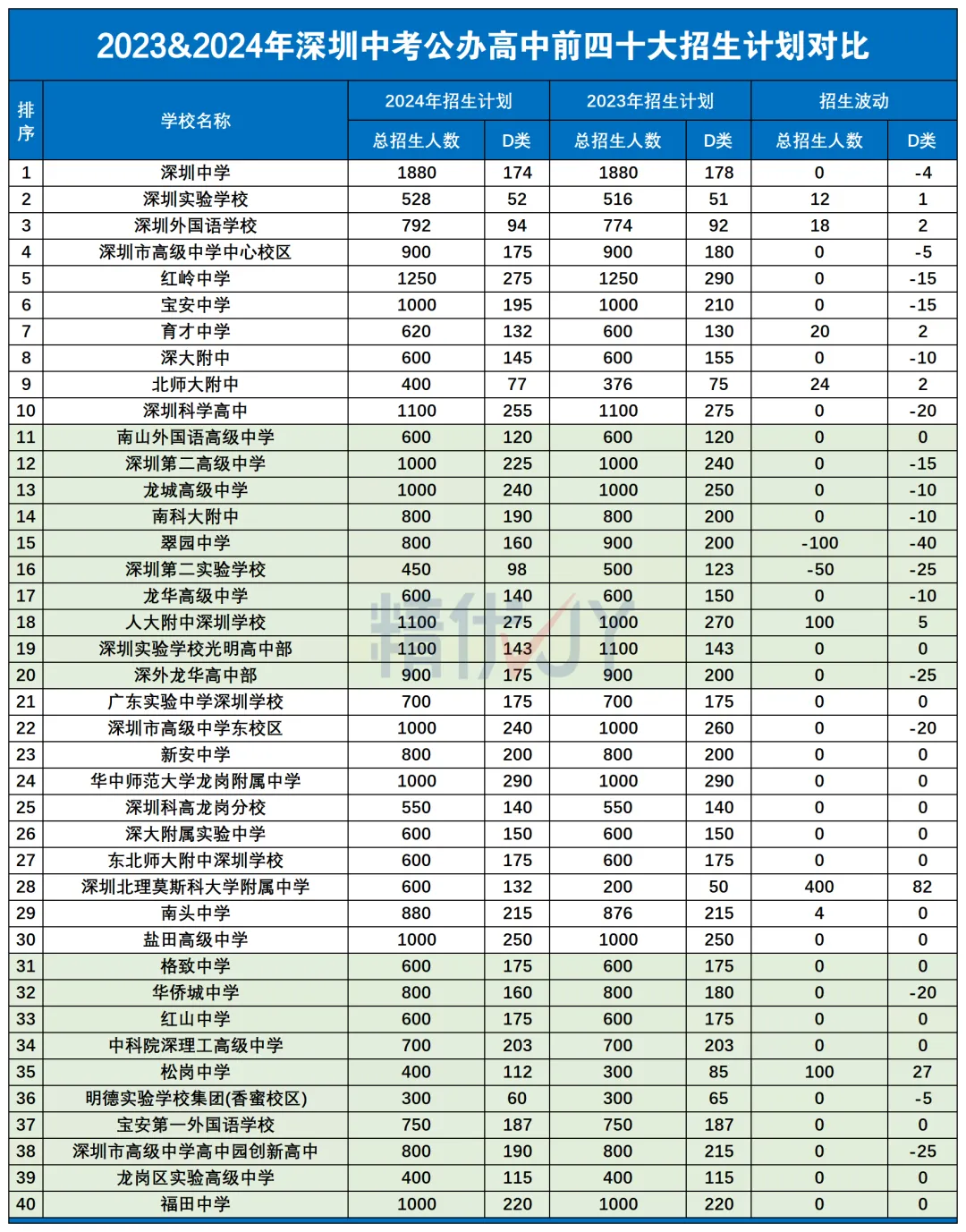 2024年,中考录取分数线排名前二十的公办高中里,D类招生仅占19.17%;前十大则为17.35%;而“四大名校”中D类招生比例更是低至12.07%,深圳中学与深圳实验学校D类招生比例更是不足10%。