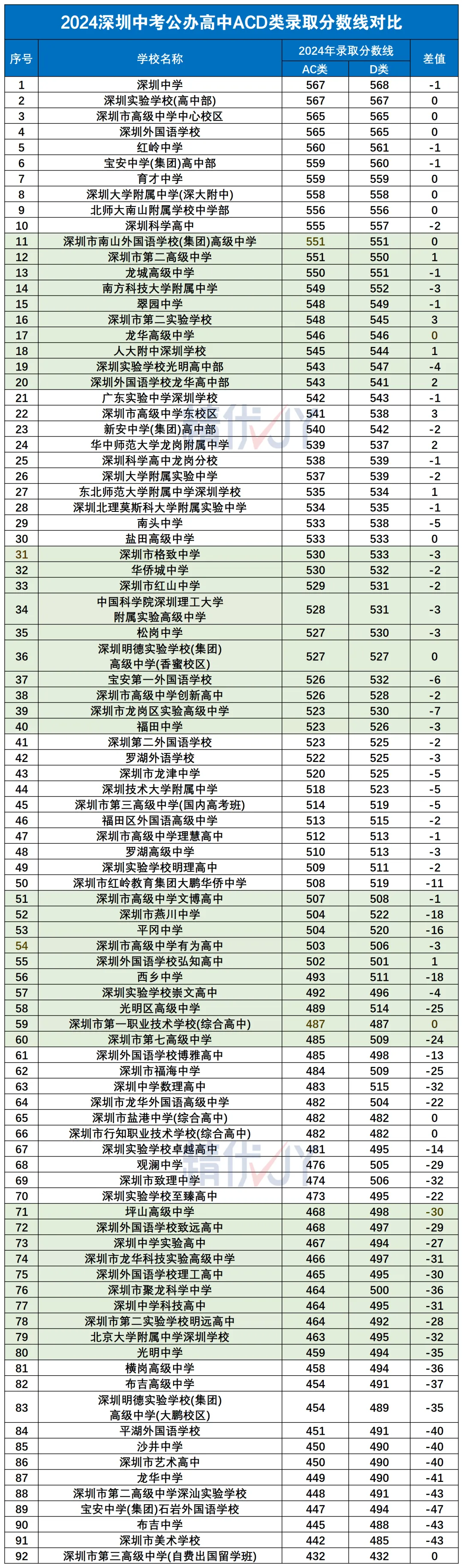 此外,2024年公办高中最低录取分数线,AC类为442分(深圳市美术学校)、D类为482分(盐港中学),相差40分。