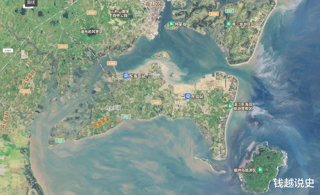 5、东海岛面积:289平方公里(一说401平方公里)。位于雷州半岛东北部的雷州湾中,地处湛江市区东南面,是我国第五大岛屿,广东第一大岛屿。岛上旅游资源丰富,岛屿东部长达28公里海滩,为是“中国第一长滩”。东北部龙腾至蔚律一线,水深26-44米,拥有可建设国际一流深水大港的条件。