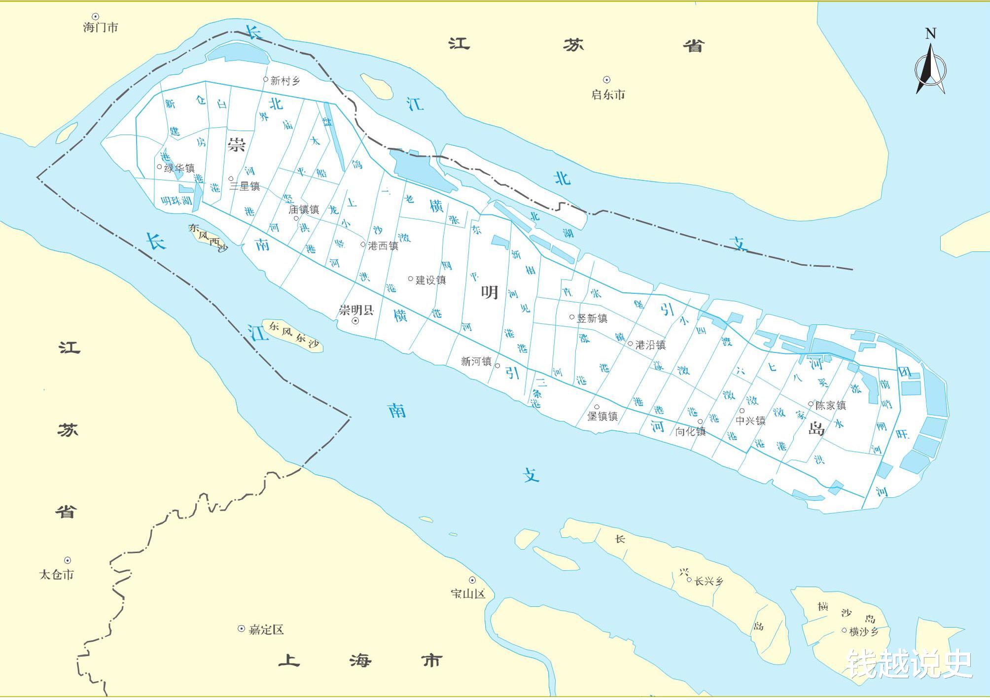 岛上地势平坦、土地肥沃,林木茂盛,物产富饶,是有名的鱼米之乡。它是我国大岛中唯一一个分属两省的岛屿,主体属于上海市,北部小部分属于江苏省南通市启东市启隆镇和南通市海门区海永镇。
