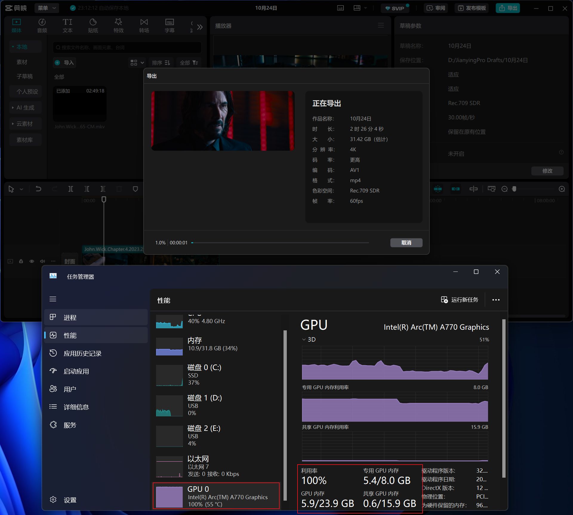 目前非常多人用的剪映已经支持AV1编码,intel ARC系列显卡凭借内置的Xe媒体引擎,能对AV1编码提供原生支持,啊鲁使用剪映导出4K分辨率的《杀神4》电影,导出格式为AV1编码。