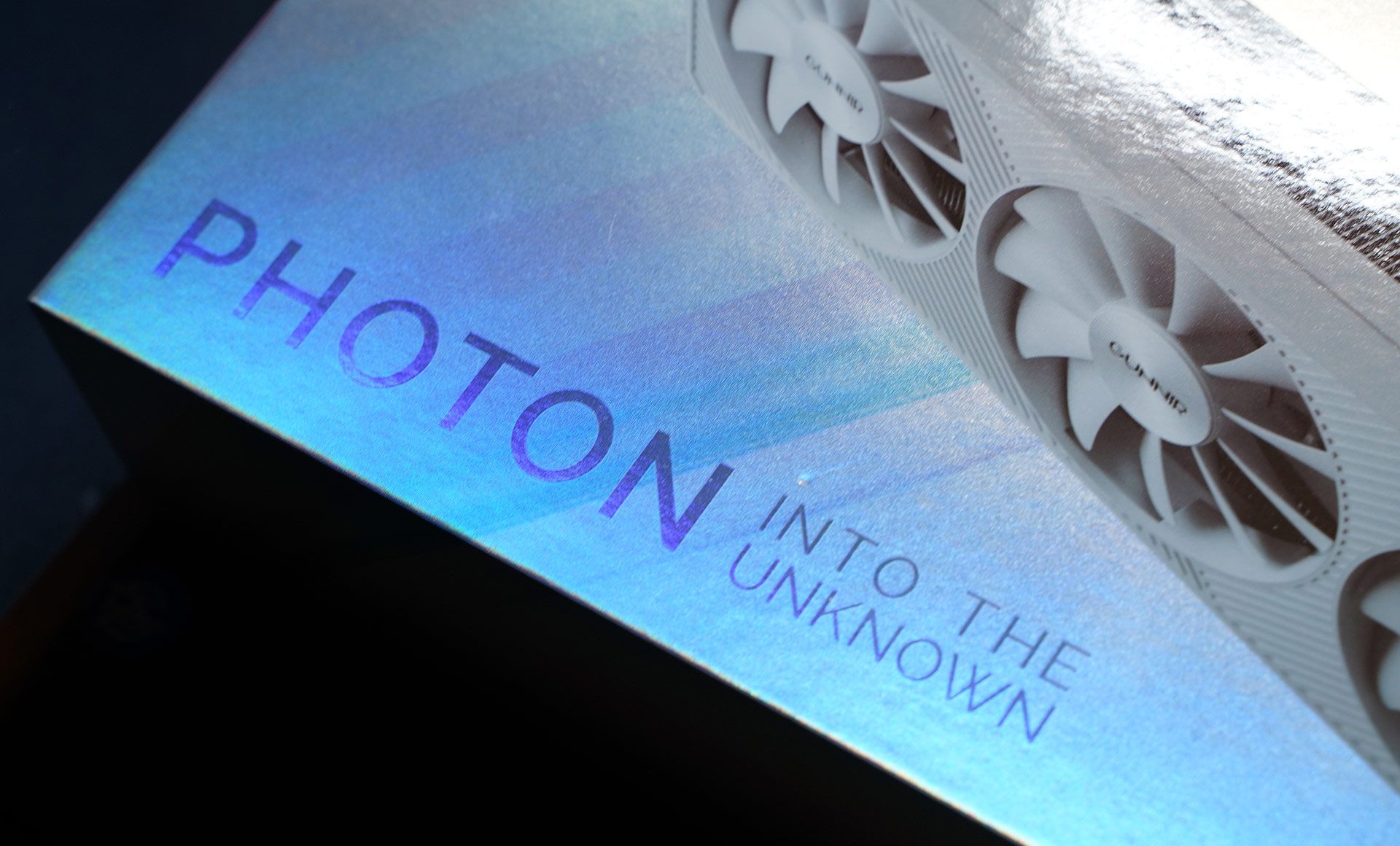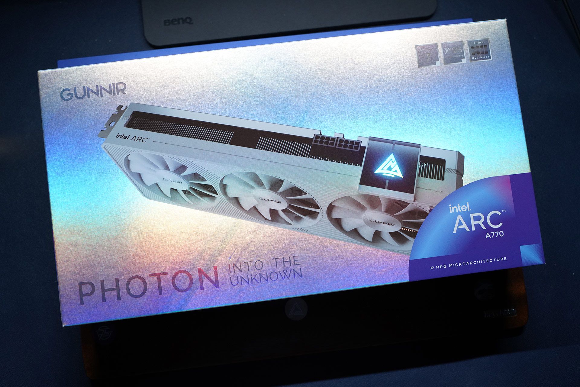 不得不说蓝戟Arc A770 Photon 8G显卡的外包装相当赏心悦目,幻彩渐变的配色给人一种迷幻的既视感,在不同的光线角度下看都能有不同的色彩。