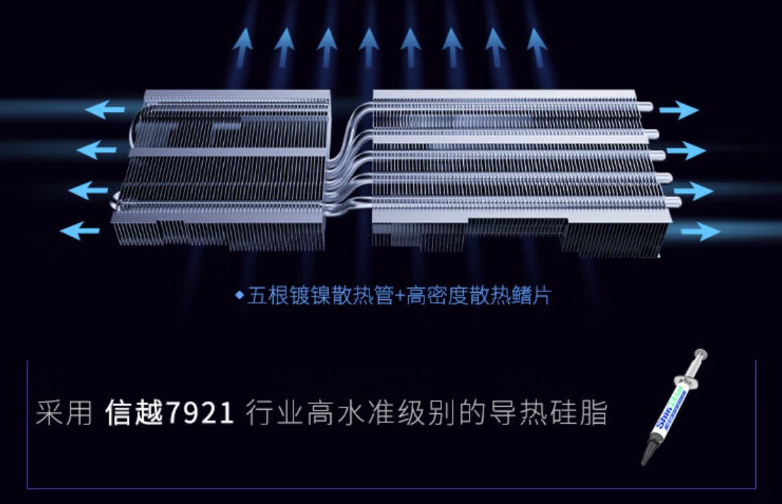 该显卡采用五根镀镍热管+高密度散热鳍片,配合三旋帆翼风扇能让显卡效能充分发挥,值得一提的是在很多人忽略的显卡导热硅脂上蓝戟也没有忽视,采用了信越7921行业高水准级别导热硅脂,玩电脑DIY时间久的玩家都知道这款硅脂的含金量有多高!