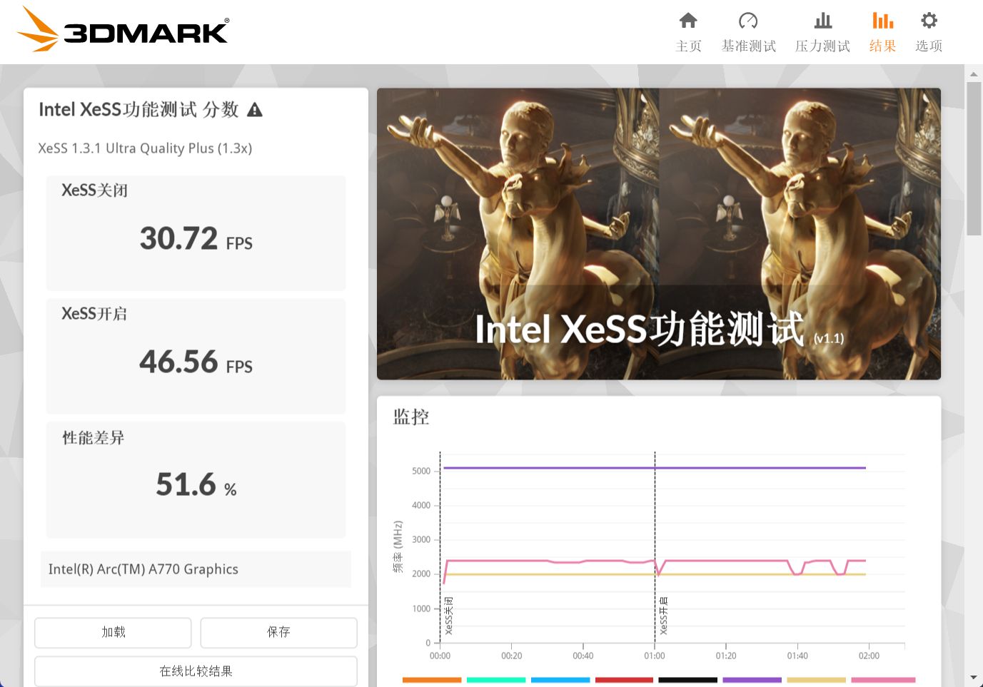 而在XeSS极致画质测试中,在关闭XeSS状态下帧率只有30.7,开启后帧率为46,两者性能差异也有51%。