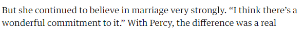 对于柯林斯来说,她其实是一直坚信着婚姻的,她觉得这就像是个美好的承诺,她想要获得这份美好,所以一直走在寻求真爱的路上。而Percy可能就是她寻寻觅觅多年的婚姻承诺。