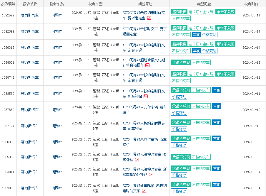 自2024年1月8日开始,陆续有多位定购了问界新M7的车主向节目组反映,定车后(定金5000元)厂家无法按时交车,也不愿意退定金,为了大家更清楚的了解,具体见下表: