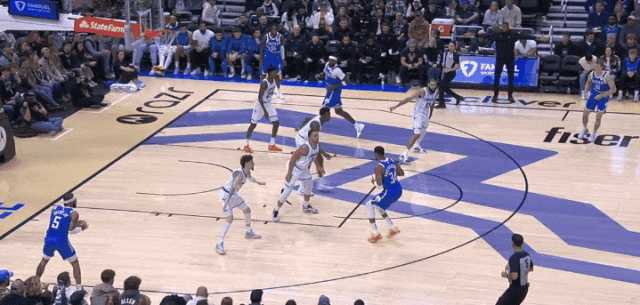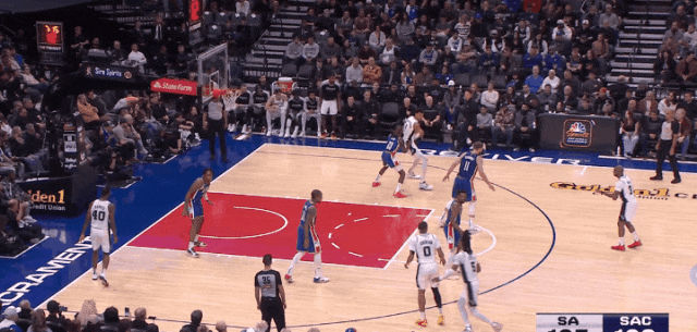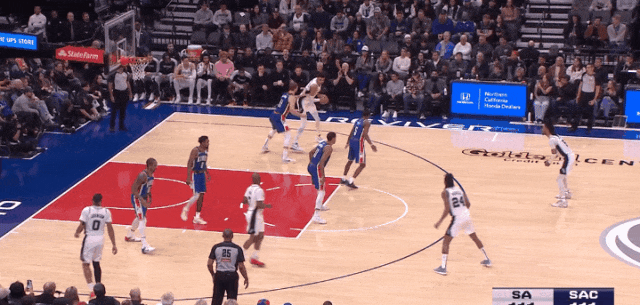 他依然卡不到位置,但硬伸手摘一个后场篮板。进攻端背打,终于引国王夹击了,于是喂弱侧瓦塞尔三分。回头盖掉德罗赞上篮。
