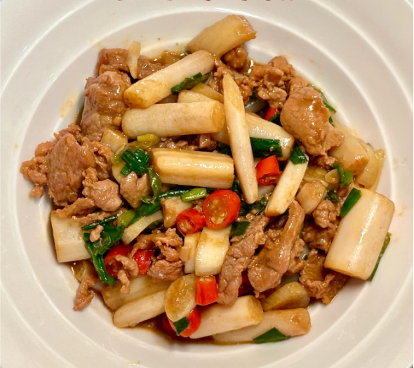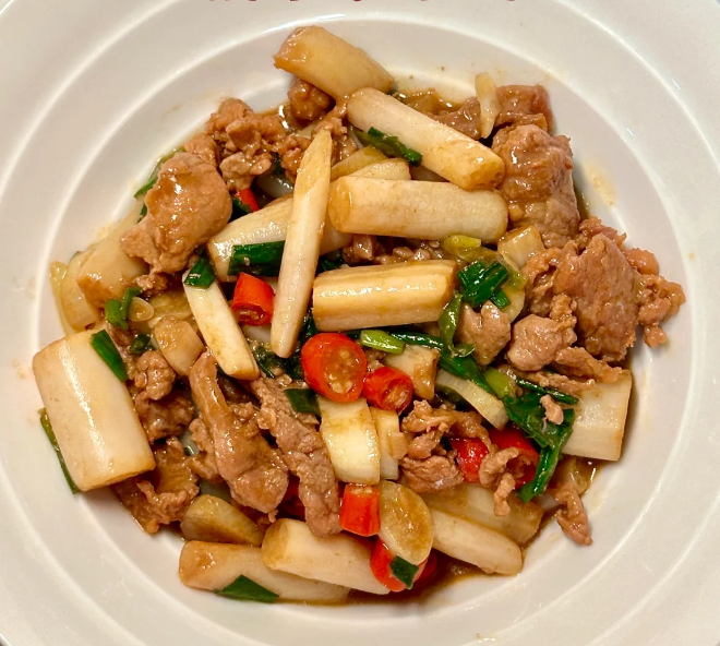 出锅装盘:最后,撒上葱花点缀,一盘色香味俱全的泡椒藕带炒牛肉就大功告成了!