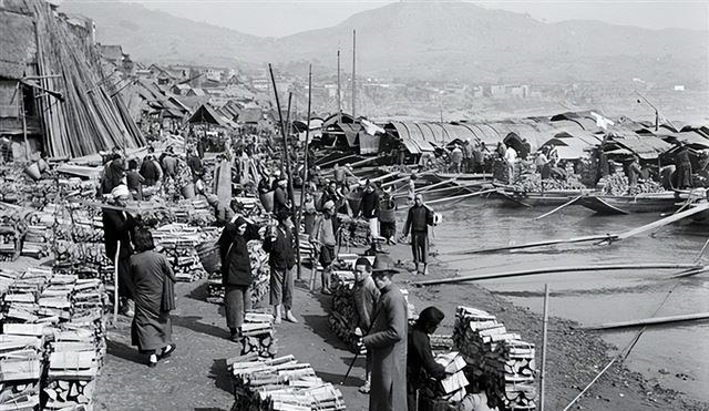 那时候没有现代化的机械,全靠人力搬运,所以你能看到许多工人用肩膀扛,用杠子抬,汗水直往下淌。
