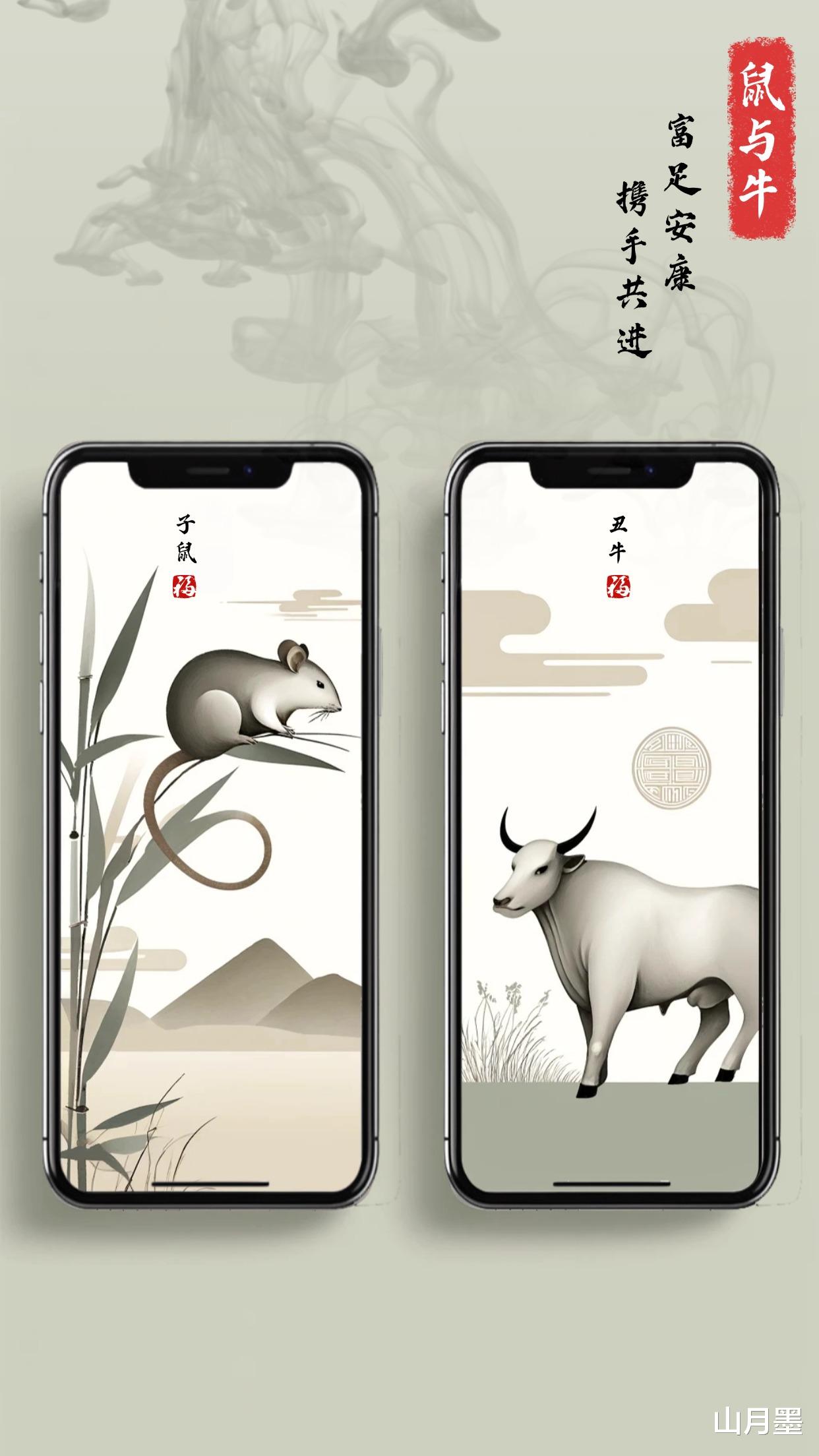 鼠与牛(子丑合):富足安康,携手共进,象征丰收与长久的情谊。