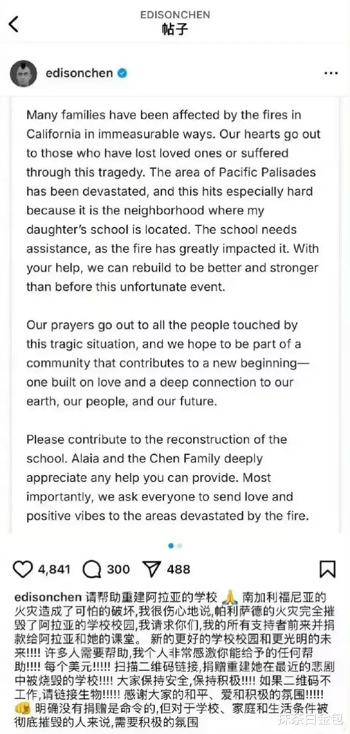 艺人陈冠希在社交平台上发文表示,其女儿Alaia的学校也在这场火灾中被彻底摧毁,急需善款重建校园,并呼吁其支持者、粉丝捐款。陈冠希写道,“我请求你们、我所有的支持者来捐款,帮助Alaia和她的同学能有崭新的校园和更光明的未来。”