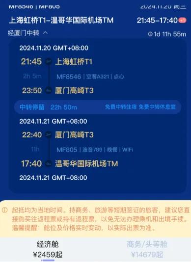 同一时间段,同一航线,选择厦门航空的单程价格为2459元。中转的时间也稍微长了一些,需要22小时50分左右,但是航司将免费为乘客提供住宿和休息室。有需要的乘客,可以在当地简单休息一下后,体验一下厦门的风土人情。
