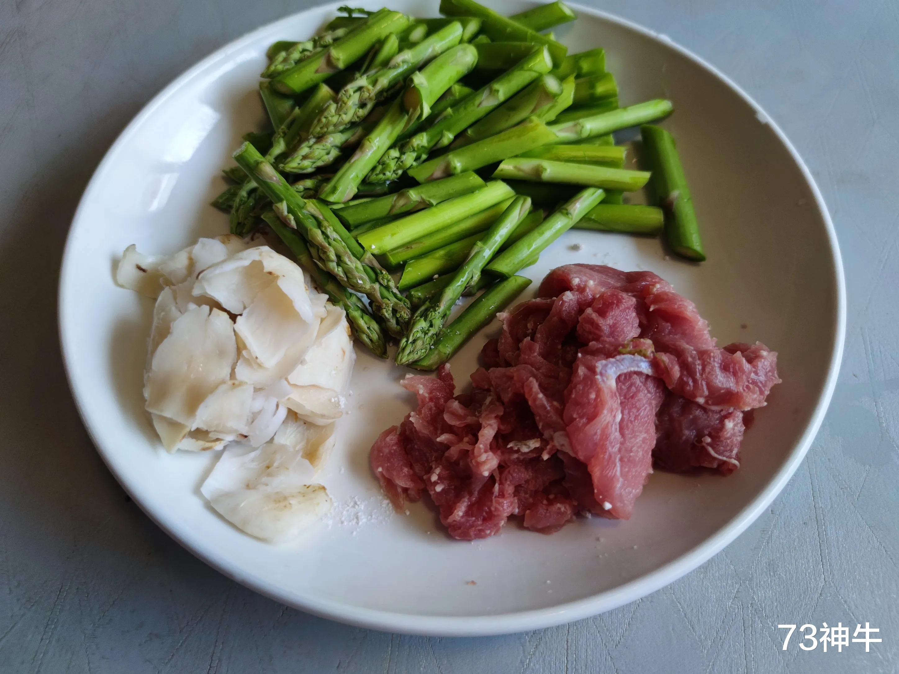 1.芦笋清洗干净后切去老根,用刮刀刮去掐不动的外皮,改刀成菱形段,百合泡发后沥干水分,里脊肉切成薄片。