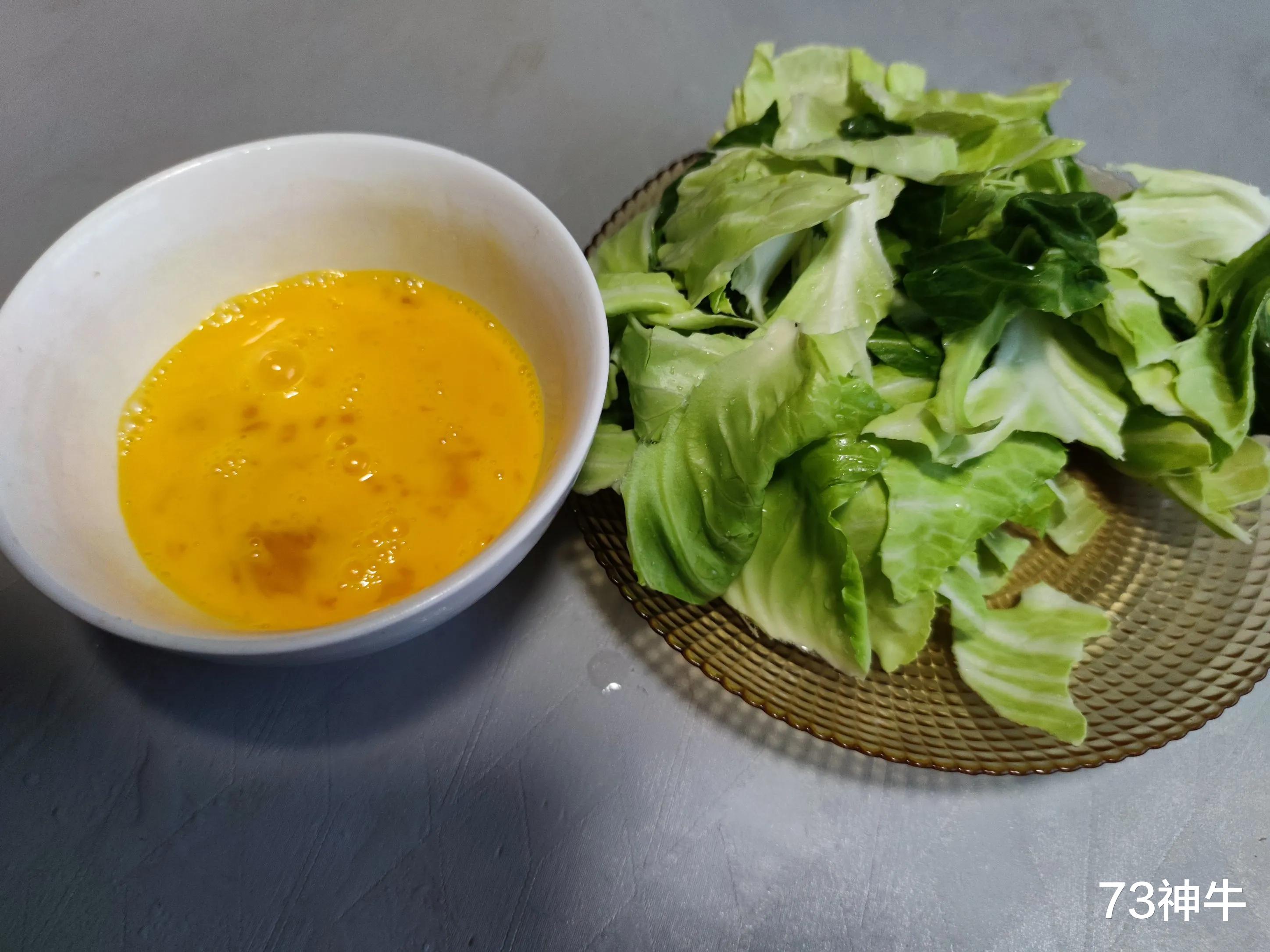 2.浸泡好的包菜沥干水分,用手撕成大小均匀的块,把菜帮和菜叶部位分开,鸡蛋打散后加入料酒、盐和胡椒粉搅拌均匀,然后入锅中炒至蛋液凝固后盛出。