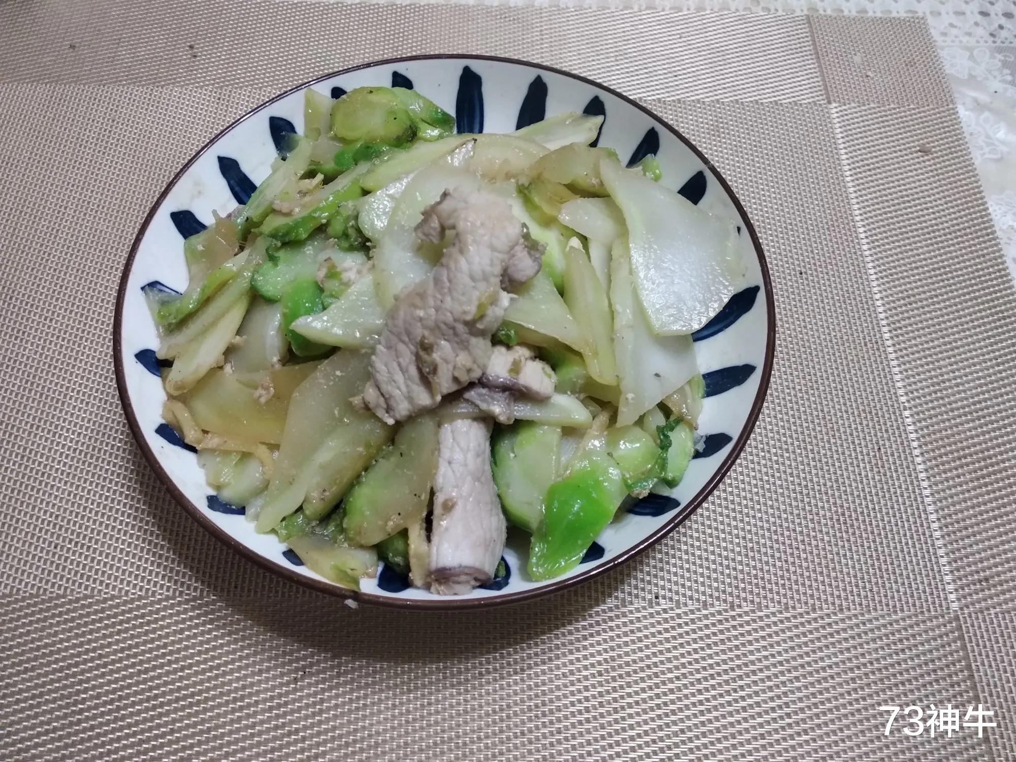 1.儿菜剥去外部的菜叶,用刮刀刮去外部老皮,里脊肉切成硬币厚的薄片。