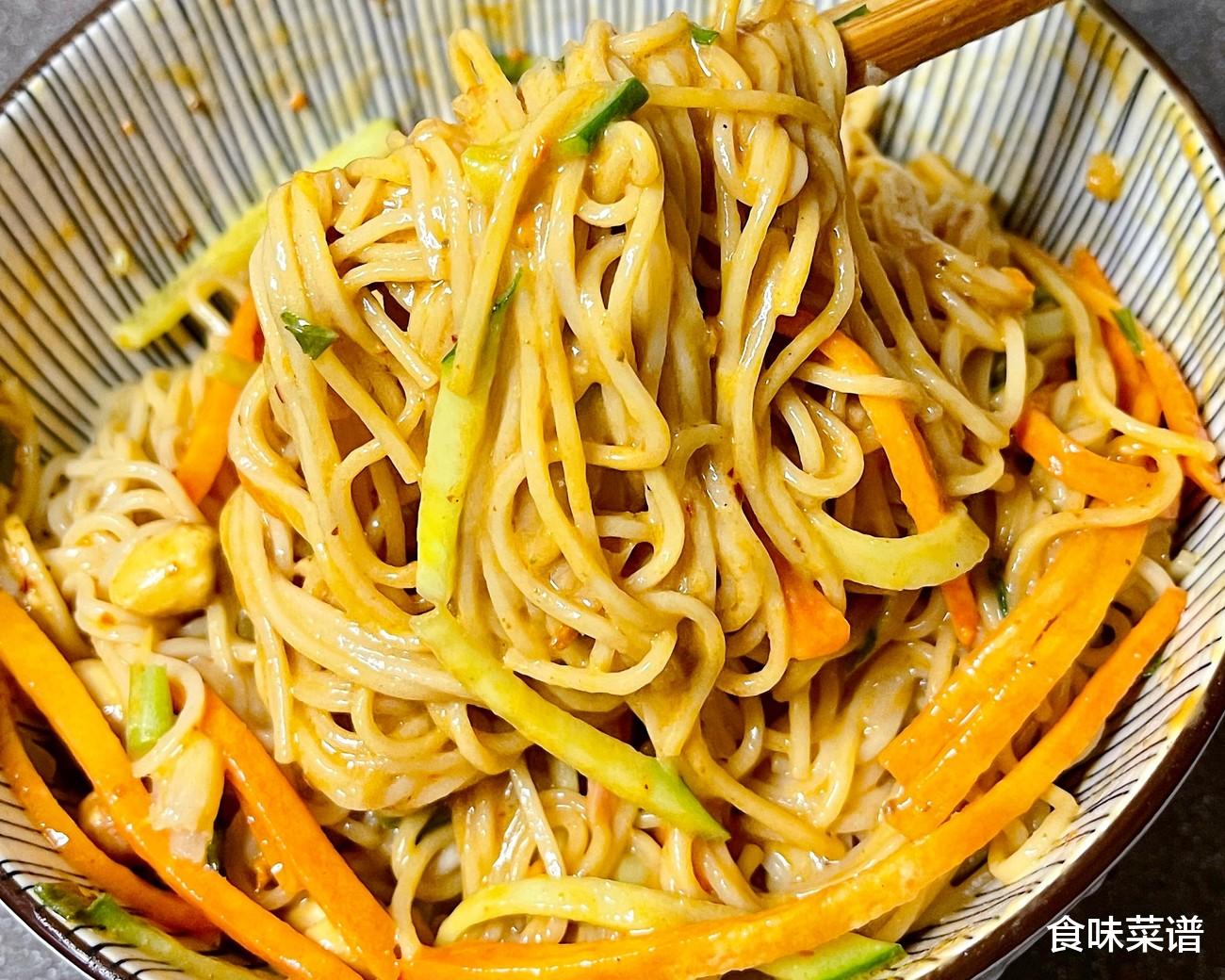 3、芝麻酱中舀入生抽、香醋、辣椒油、蒜末、食盐和白糖,舀入2勺开水,顺时针搅拌均匀,另外准备一些配菜,黄瓜丝、胡萝卜丝、花生米之类的,把料汁淋入,搅拌均匀,天热吃着更舒服,鲜香美味。