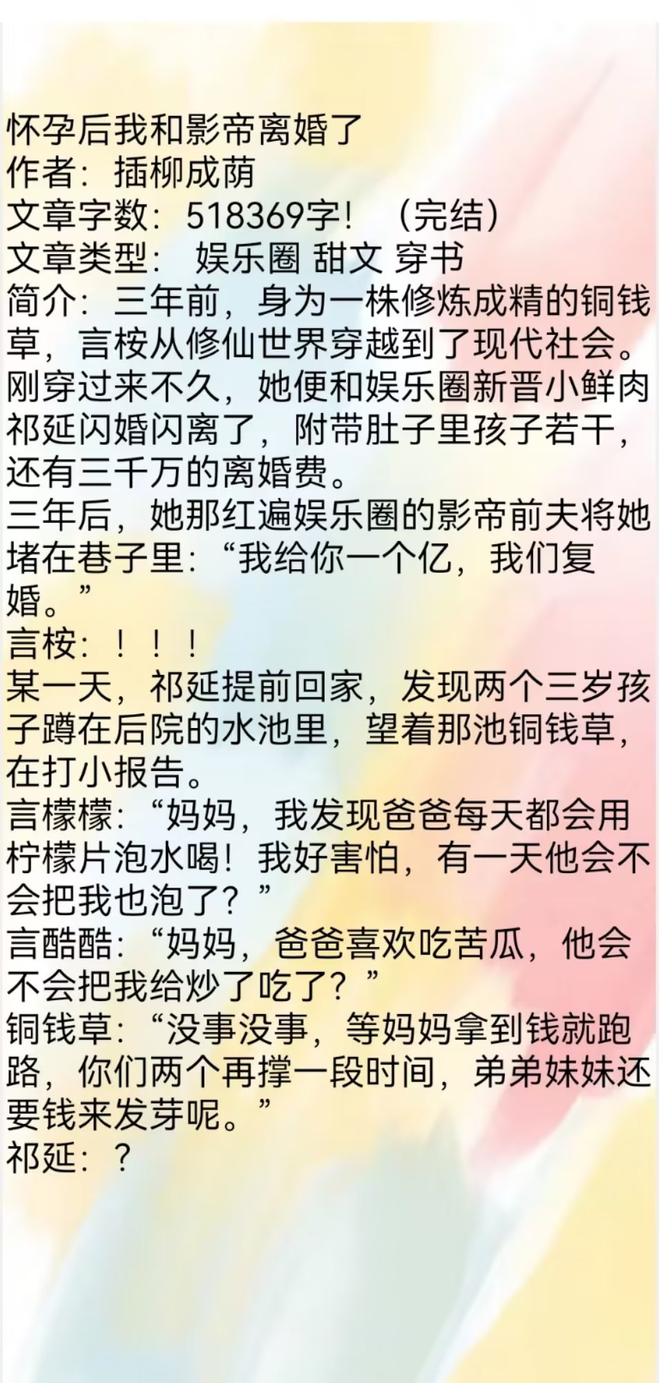 三、《怀孕后我和影帝离婚了》作者:插柳成荫四、《豪门老公又给我打钱了》作者:桃花引