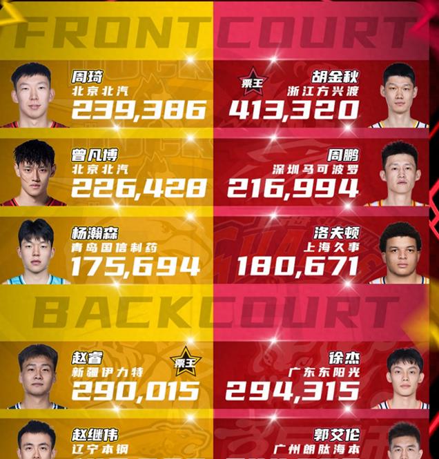 至于北区其他人分别是周琦、曾凡博、杨瀚森和赵继伟。周琦在加盟北京之后,他的人气是不差的。现在恢复越来越好,未来肯定可以出现在全明星。曾凡博本赛季攻守齐爆,打出了一个绝对核心球员的角色,他获得了众多球迷青睐。杨瀚森则是希望之星,他立足青岛内线,他是必不可少的一部分。赵继伟即便本赛季的伤病还是多,但目前恢复不错,他的人气必然不会低。