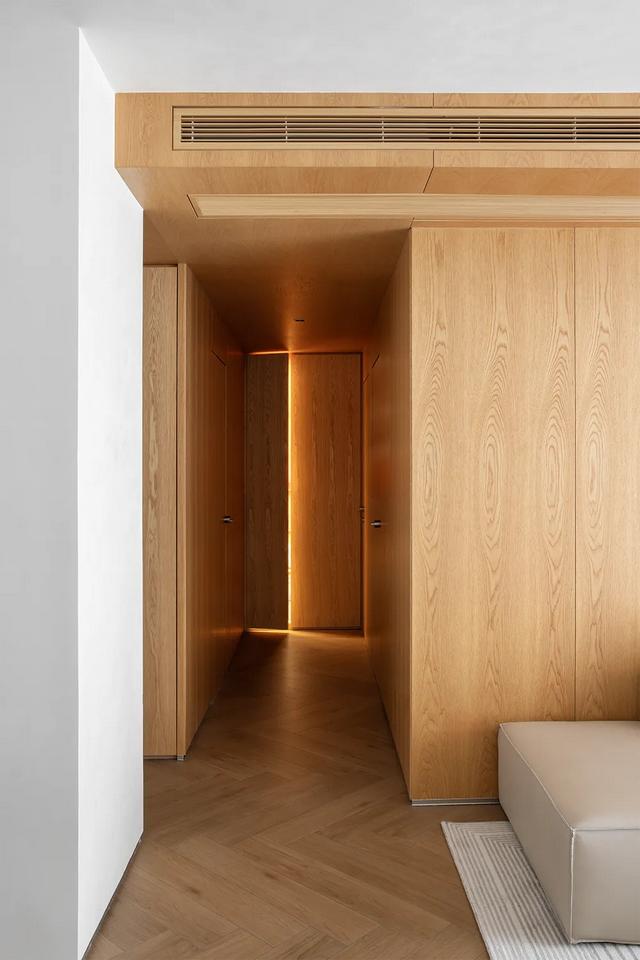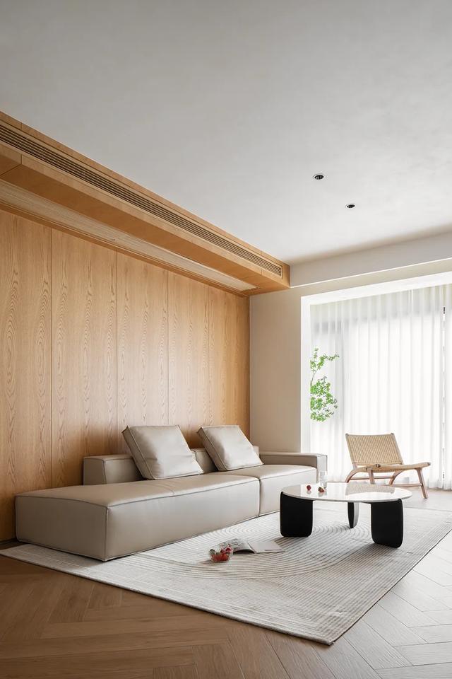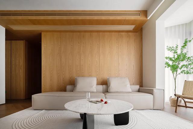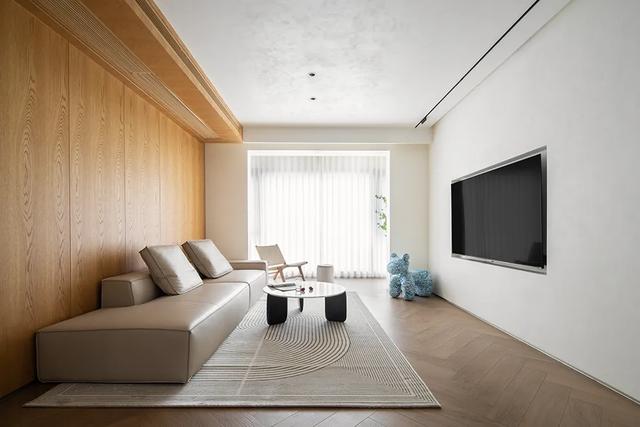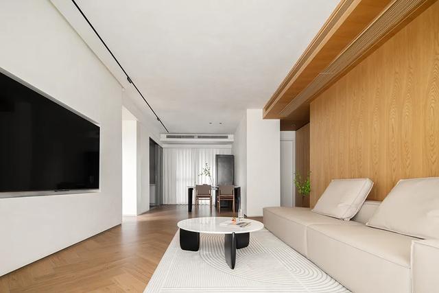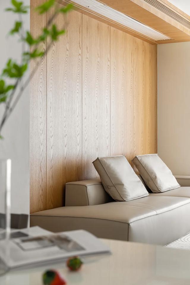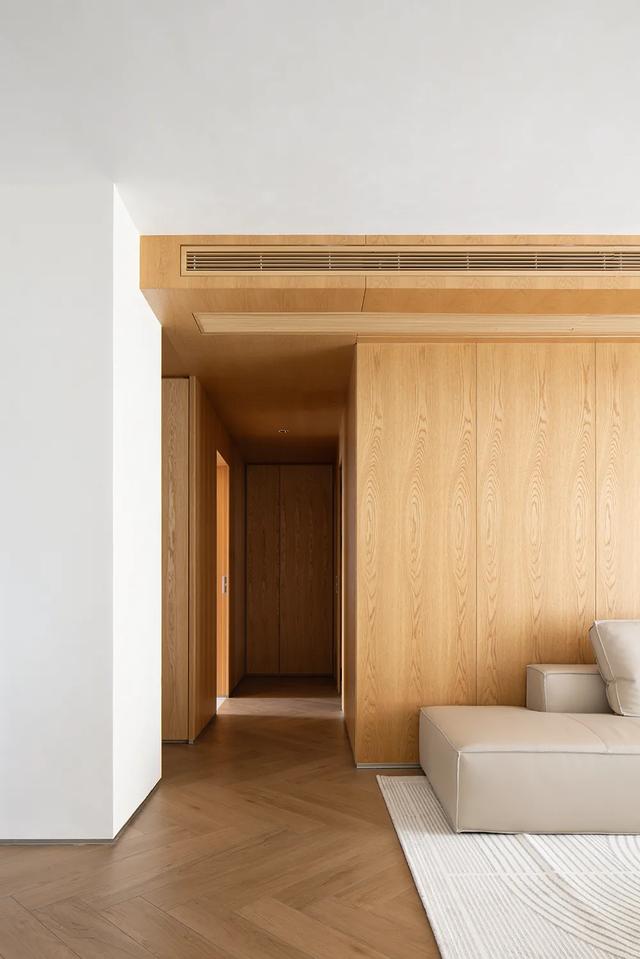 本案结合业主的需求,将四房改为三房,在设计手法上,去繁留简,材质使用大量橡木木皮,墙身则是用了肌理感比较强的涂料,使之更贴近自然,配上舒适恰到的比例和空间尺度,满足现代极简的居家生活。