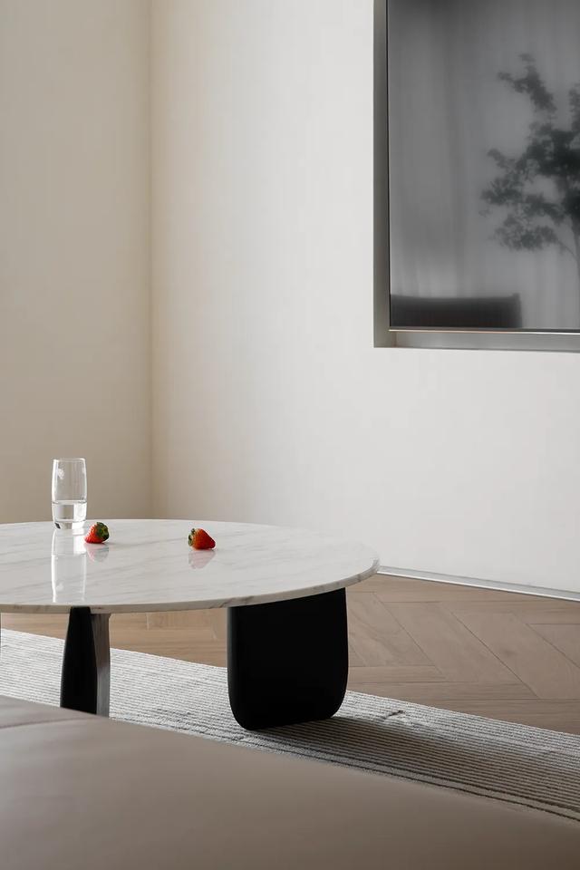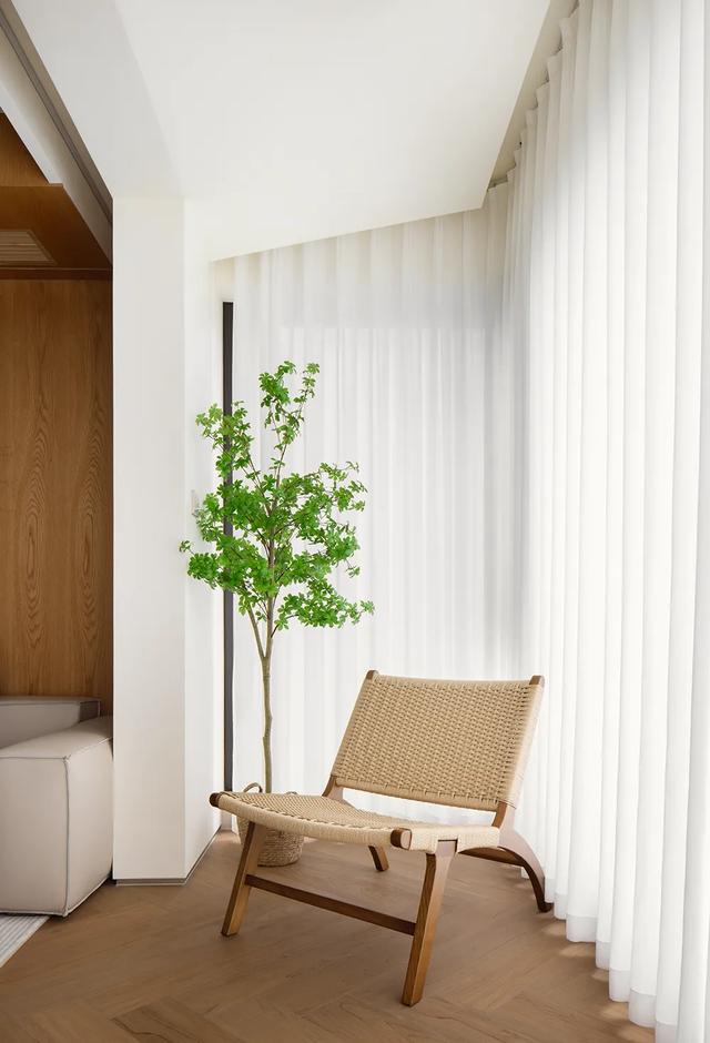 大面积的落地玻璃窗门,让室内与阳台风景自然相融,无过多繁杂,使整个空间更加简洁、清晰,从而让空间更得纯粹,让居者专注于生活本身。