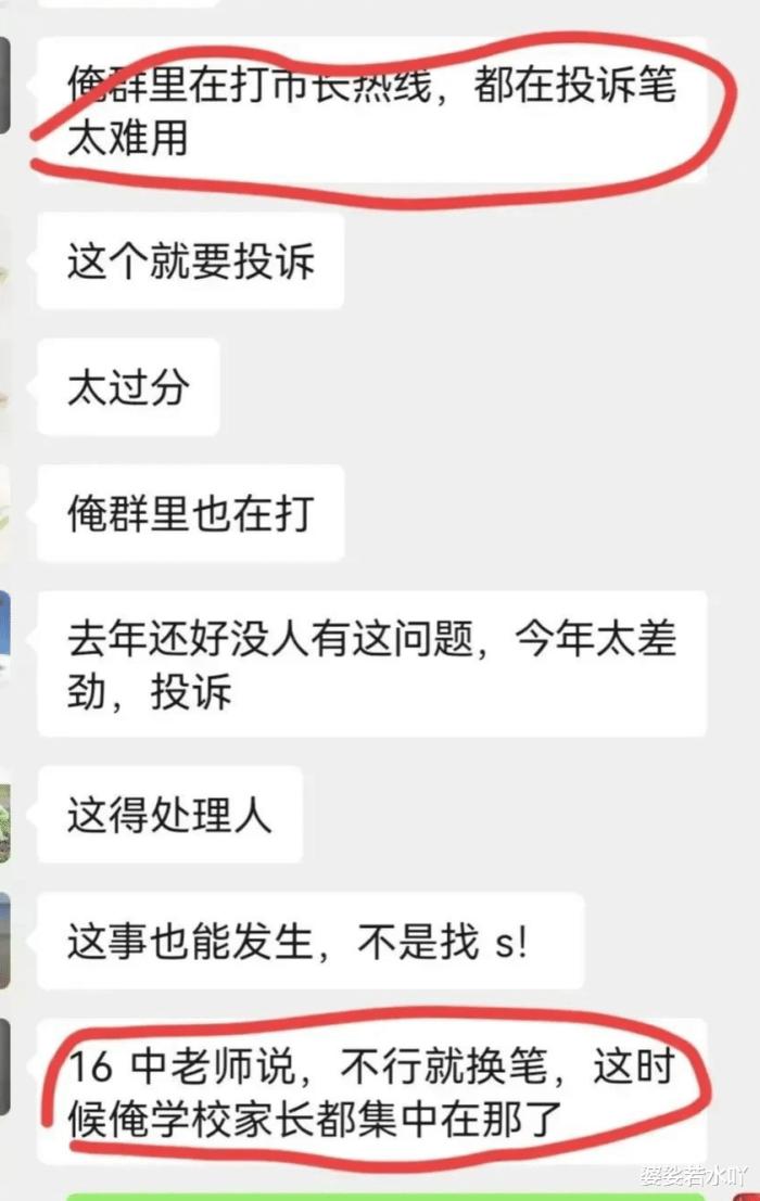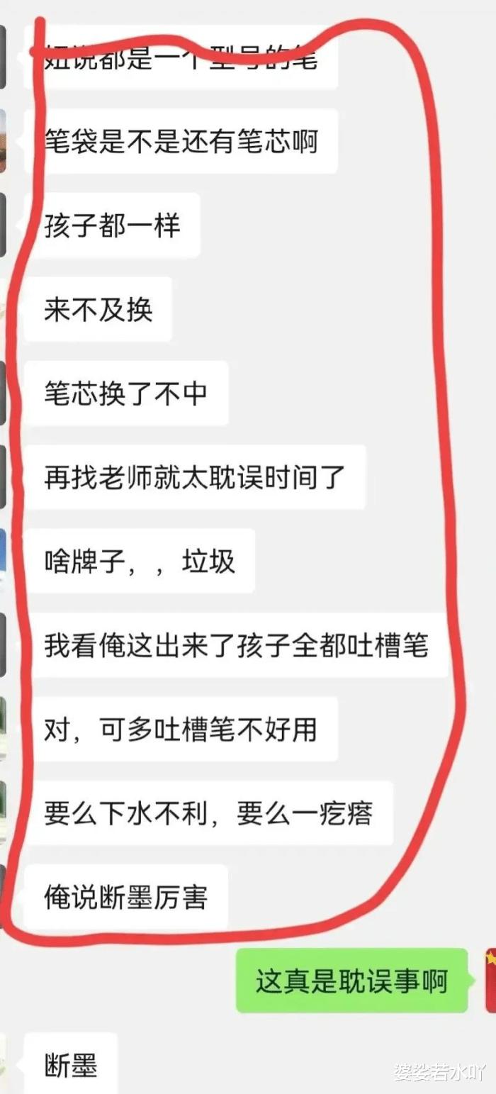 本以为这只是该群的一个个例,谁知事情出来之后,有很多家长都叫苦连天:笔芯换了不中,叫老师又耽误时间,要么下水不利,要么出来一疙瘩,很耽误事啊。