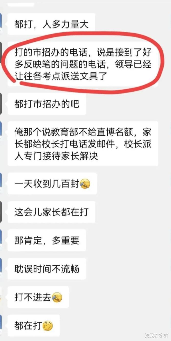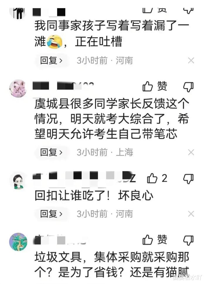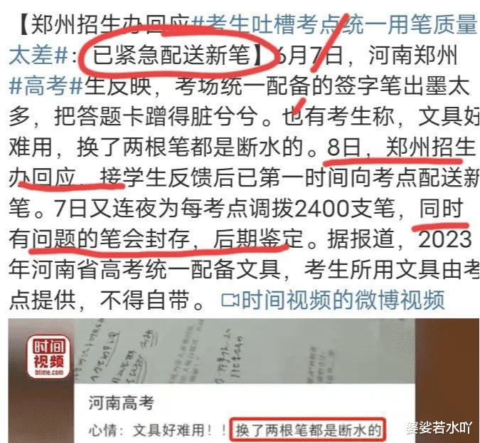 舆论纷纷,有家长表示:打了市招办的电话,说是太多人反映笔的问题了,已经开始往各考点配发新笔了。
