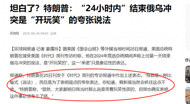 在《时代》的采访中,当他被问及这一承诺时,特朗普才不得不承认,他所谓的“24小时内结束战争”只是一个比喻,一个象征性的说法,是夸张的表达。