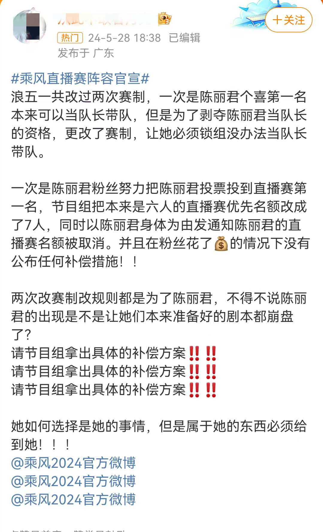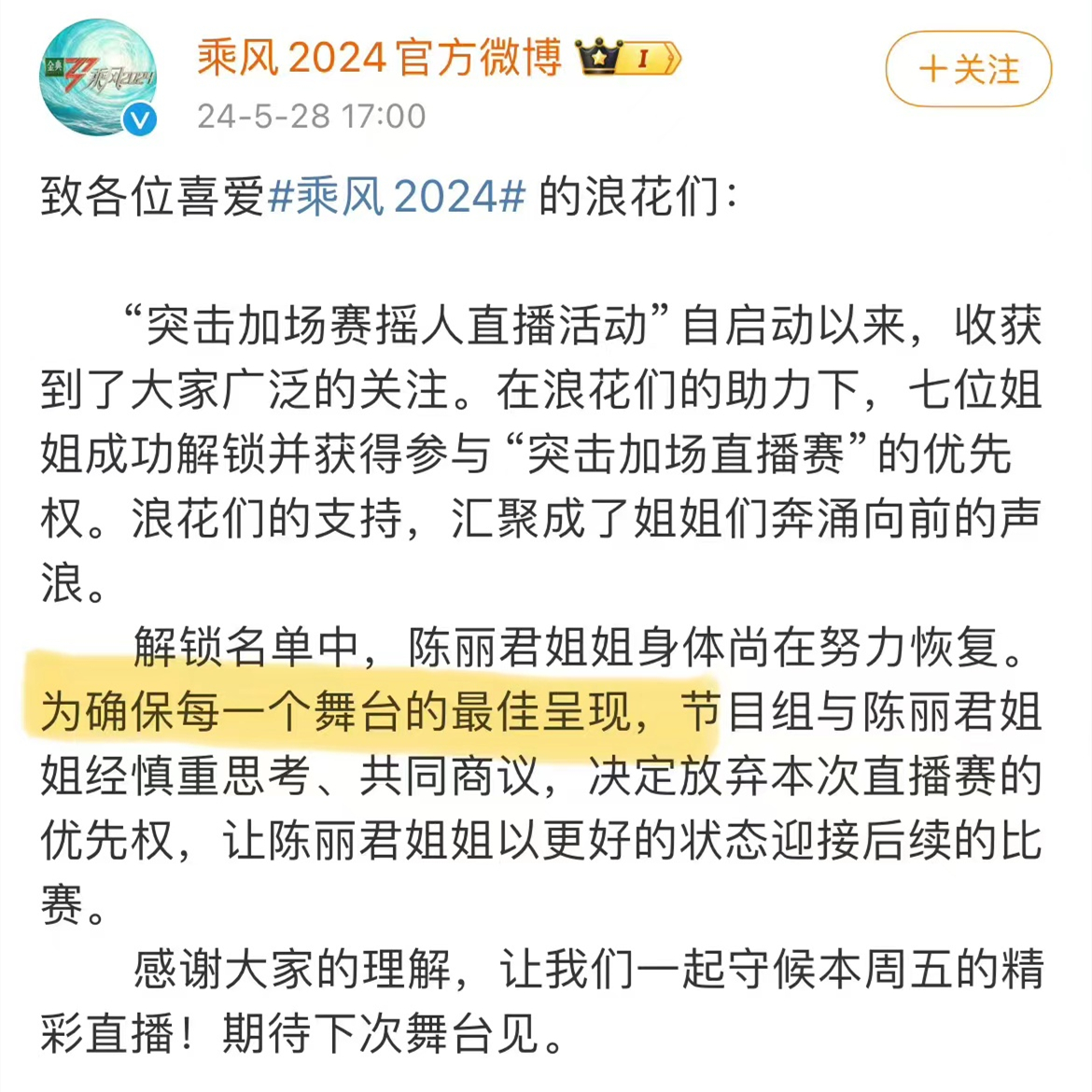 因为这个直播赛的名额,本就是靠粉丝和路人日以继夜的打榜得到的,在22号启动到24号结束的这三天打榜中,很多粉丝都是拼命的帮陈丽君拉票。结果仅仅过了几天,就传出陈丽君因为生病无法参加的情况,而且从描述上看,陈丽君生病并不是特别严重,只是担心舞台呈现不佳。