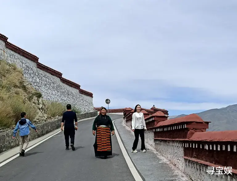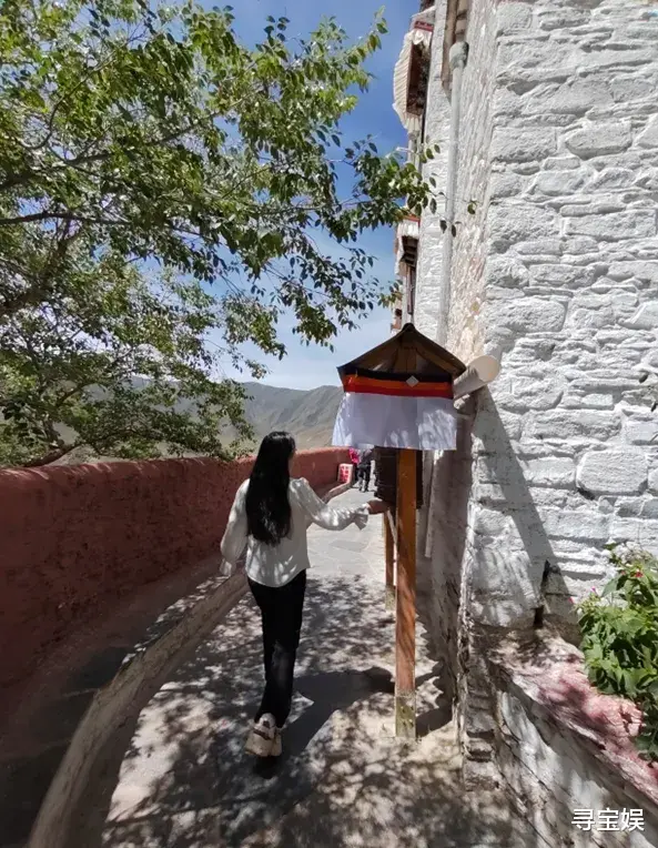 走进宫殿,见许多精美的壁画艺术,生动形象描绘出了历代赞普的生活与劳作。贡奉的许多佛像。雍布拉康在2100年的风雨中,几经修复扩建,凝聚各时期建筑艺术,从建筑角度和文化角度,雍布拉康弥足珍贵。站在雍布拉康最高点,俯瞰,眺望,青稞田地一望无垠,让人心旷神怡。雍布拉康后山很陡,悬崖之上的山脊至山顶上,一坡挂着层层叠叠五色的经幡。有一位藏族摄影师动作熟练冒险登上顶峰,拍摄。他的女友藏族姑娘不敢上去,站下面墙根看他,等待,期盼他下来。我抬头仰视,那么多经幡,在蓝天下,离天最近的地方,在山嵴梁和山顶上,随风舞动,与白云朵亲密接触,十分壮美,惊艳了整座扎西次日山。瞬间引起我浓浓的兴致,也冒险攀登。光秃秃的山峰,怪石嶙峋,没有植物,连小草也没有。我右侧山嵴上挂的经幡,遮掩悬崖。左侧脚下,也是笔陡悬崖。阳光耀眼,风很大。只能俯下身子,双手抓住嵌在山上的石头,一步一步,总算爬上去了。登上挂经幡的山顶峰,一览众山小。我站立的地方,比雍布拉康的地理位置还要高几百米,欣赏拍摄经幡等风景,无限风光在险峰。俯瞰雍布拉康,壮观美丽。眺望远山,脚下是很高的悬崖,山下是美丽的村镇、一望无际的青稞田,一块块,整整齐齐的。一条马路,沿山脚下穿过,绵延远去。俯瞰风景,很惊喜。可下山时,十分发愁,上山不易,下山更难。山太陡,没路,只能沿崖边蹲地爬,很危险,根本不可能站起身走下去,双手紧抓长在山上的石头,不敢出大气,稍不注意会摔下去。我不敢看崖下,胆战心惊,焦眉愁脸,四肢不敢有丝毫松懈,思想高度集中紧张,全身每个细胞都是紧张的,不敢有半点闪失,好不容易一步一步下到雍布拉康的最高观景台。平安下来,我心头悬着的石头,总算落了地。挂经幡的那山,是无人区危险地。继续参观雍布拉康,从上至下,走左侧转经道,转经筒,看风光。四脚蛇爬行在红栏墙外,据说是来求财(求吃)的。到快下山的红墙外,也见到一只四脚蛇,趴在墙边,一动不动,晒太阳。四脚蛇,有医用作用,也是风水吉祥物。如果在户外遇见四脚蛇,这通常预示着即将到来的旅程平安顺利。无论是旅行、约会还是商务洽谈,都将可能取得积极的结果。驱邪避煞,寺庙外红墙见到四脚蛇,吉祥好运的象征。寺庙红墙在文化中具有丰富的象征意义。红色在藏传佛教中象征着吉祥、繁荣和幸福,红色墙体不仅具有保护作用,还承载着丰富的文化内涵和信仰象征。红色墙体使得寺庙在高原格外醒目,给人一种庄严而神圣的感觉。