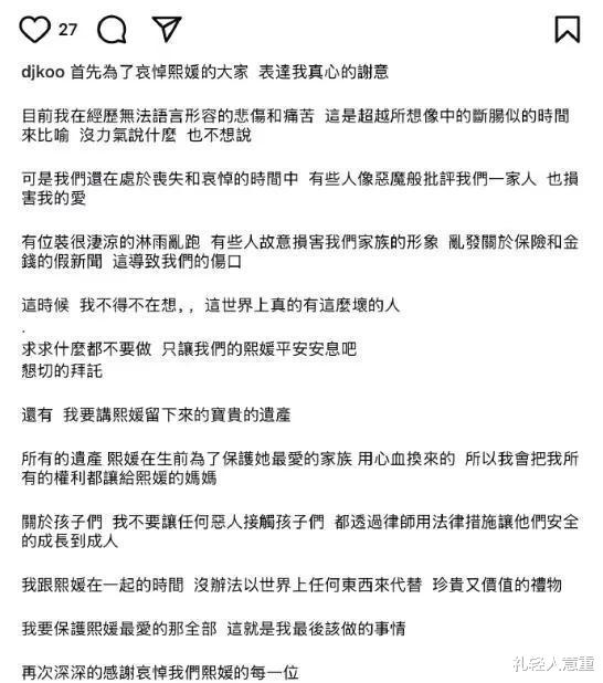 就在这样一片争议声中,六日晚间,具俊晔又发了第二份声明。这份声明呢,主要就是针对第一份声明中的第三点来进行解释的。他说啊,之前声明的翻译出了问题,才导致了这么严重的误会。他强调自己根本就不是要去争夺孩子的抚养权。他说啊,只是关于孩子涉及的遗产问题,他要好好说明一下。原来大S留下的遗产呢,在他看来,他和两个孩子都是第一顺位继承人。他自己的那一份,他1分钱都不想沾,都留给岳母。而两个孩子的份额,他会通过法律的途径保留着,就是担心被别人挪用,说白了,他其实就是在怀疑原本属于孩子的财产有被汪小菲拿走的风险。所以,为了避免这种意外情况发生,他觉得只有通过法律手段,才能确保这些遗产能够稳稳当当地留到孩子成年。