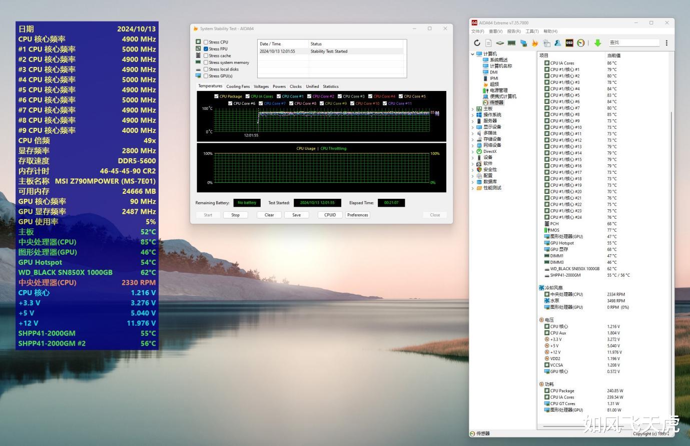 AIDA64 FPU压力测试,功耗240W,CPU温度在85度,表现不错。