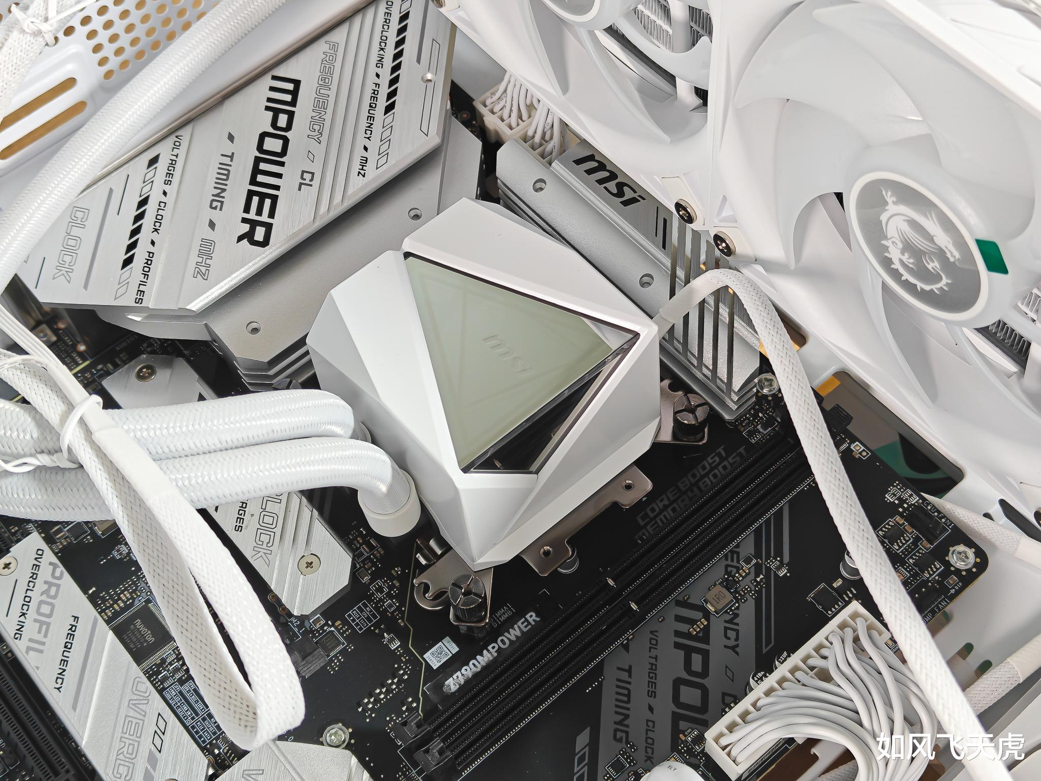 我们来安装这个水冷散热器,机箱是微星的MAG PANO M100L PZ WHITE白刃机箱,一款支持背插的海景房机箱,最大支持M-ATX主板。主板是微星的Z790MPOWER,针对内存超频进行了优化。主板12+1+1项供电,单项电流最大75A,双8PIN供电接口。2个DDR5插槽,内存超频利器。侧面进风使用了反向风扇。