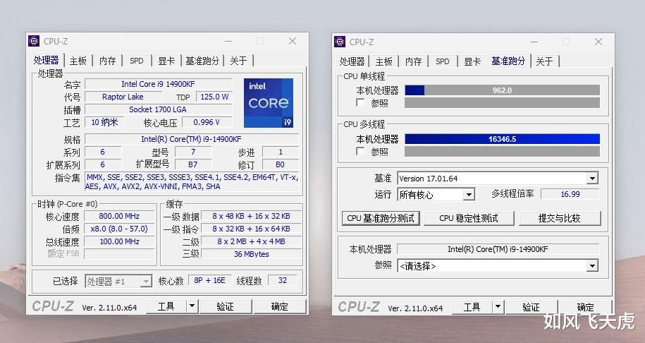 运行CPU-Z,我们看正确识别,CPU-Z跑分多核16346.5,单核962.0。