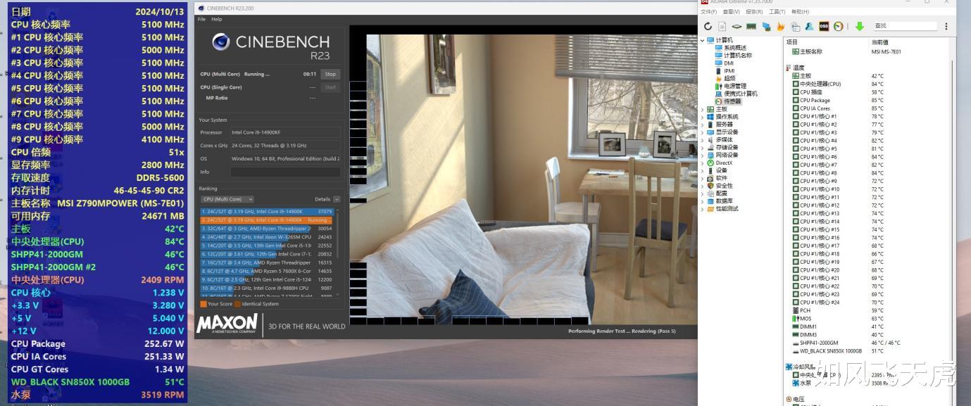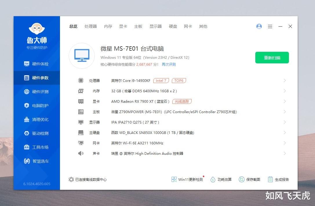 来看看电脑的配置,CPU是英特尔i9-14900KF,内存是宏碁DDR5 6400MHz,显卡是蓝宝石RX 7900XT,主板是微星Z790MPOWER,硬盘是西数WD_BLACK SN850X。