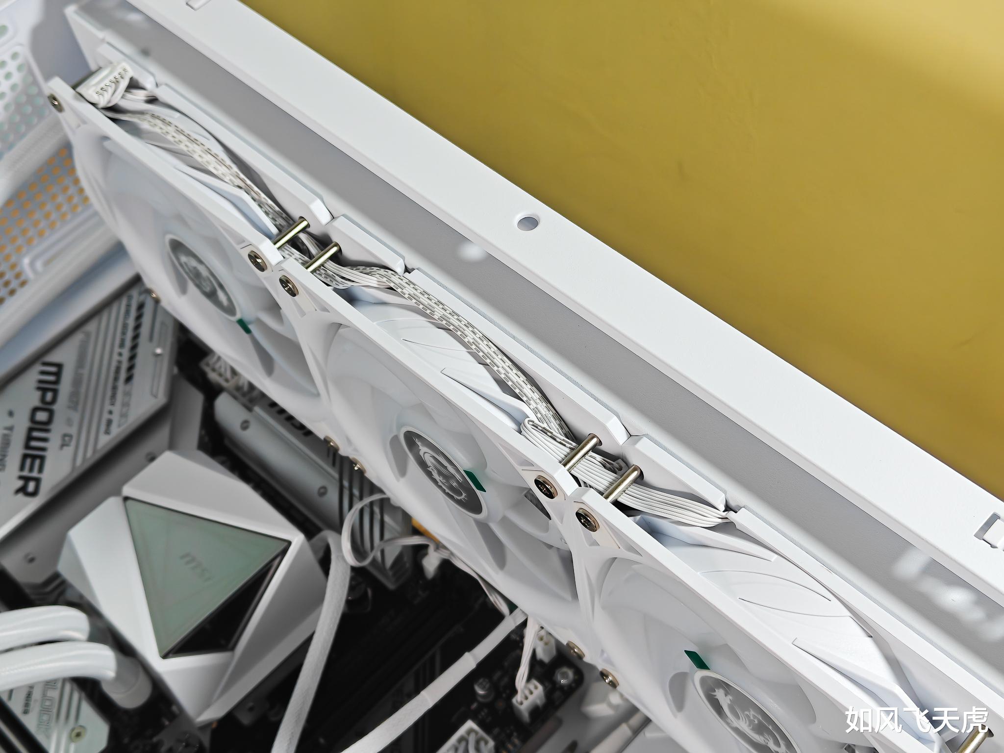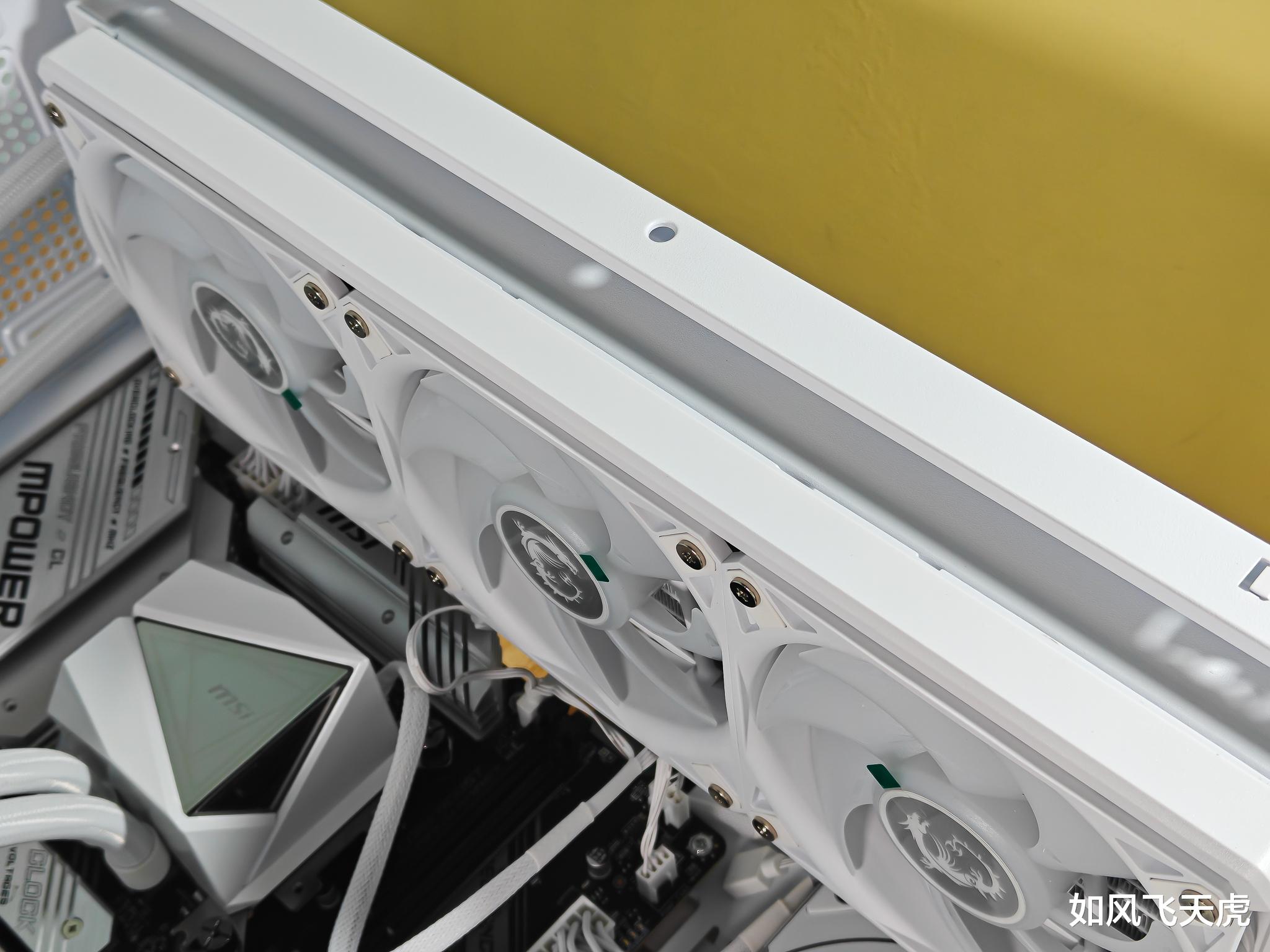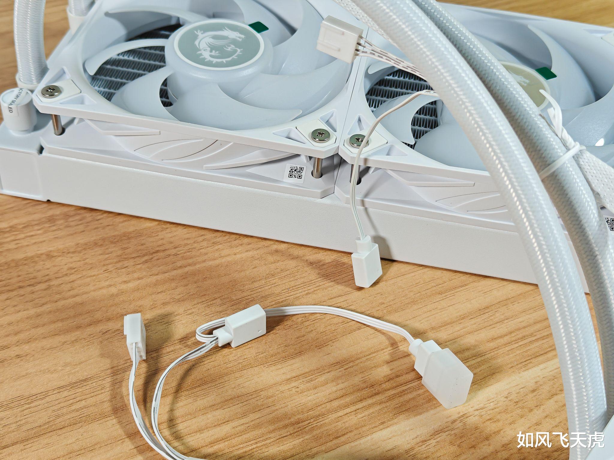 好了,回过头来来看水冷散热器。这块水冷是全身白色。从冷排、风扇、水管、冷头乃至于线材都是白色的,可谓是真正的白色水冷。冷排风扇已经预装好了,节省了很多时间和精力。