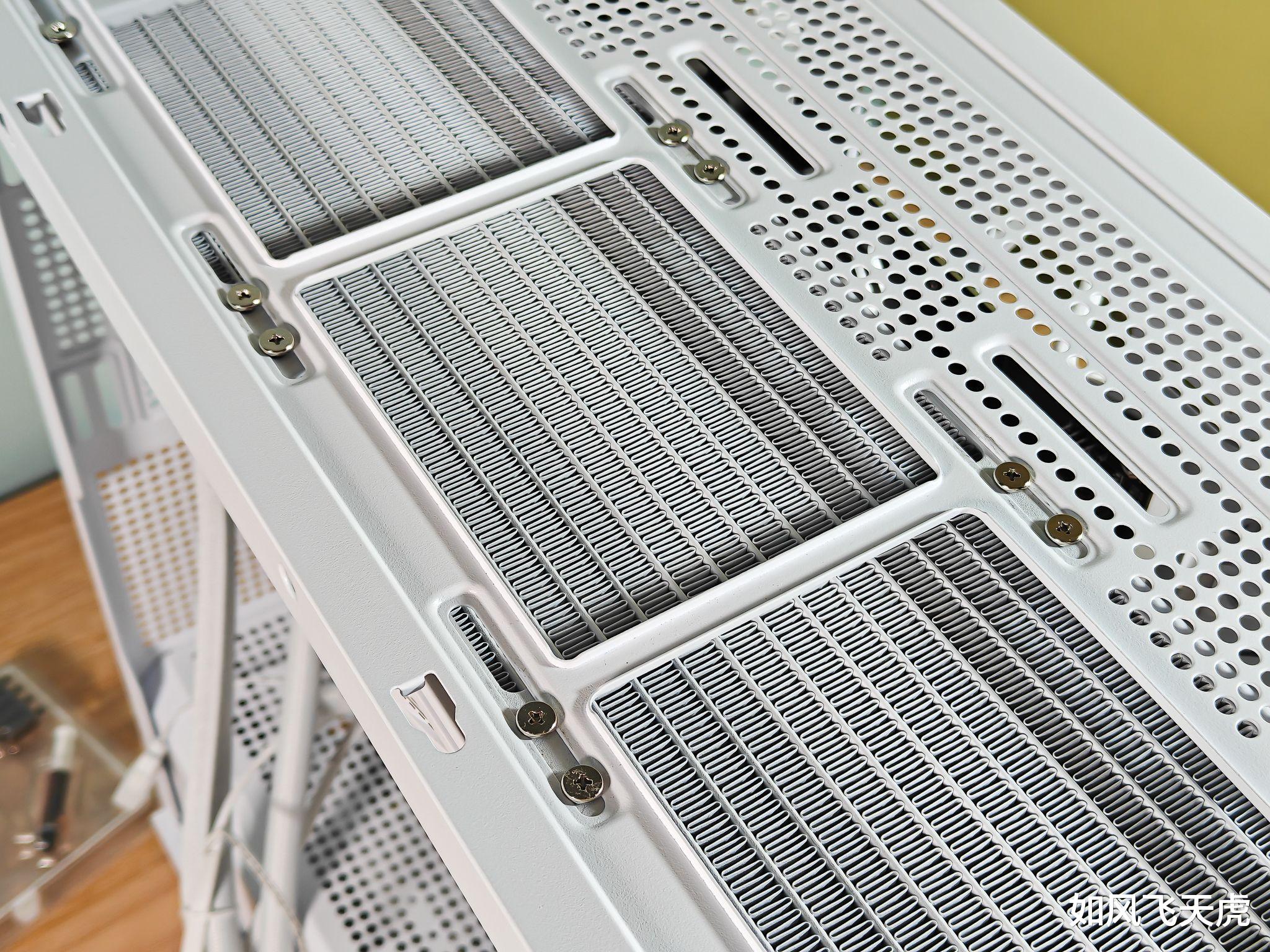 首先安装冷排到机箱顶部,我们看到固定的螺丝都是银白色的。