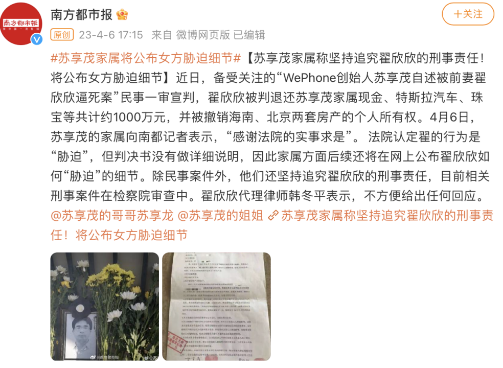 2018年,苏享茂的家人将翟欣欣告法庭,要求法院撤销苏享茂价值近千万的赠予,并要求对方返还近百万现金。