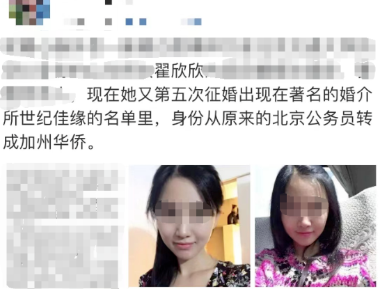 而四婚四离后,2022年12月,疑似翟欣欣又在婚恋平台发布征婚广告。如果属实,这已经是她第五次在征婚了。