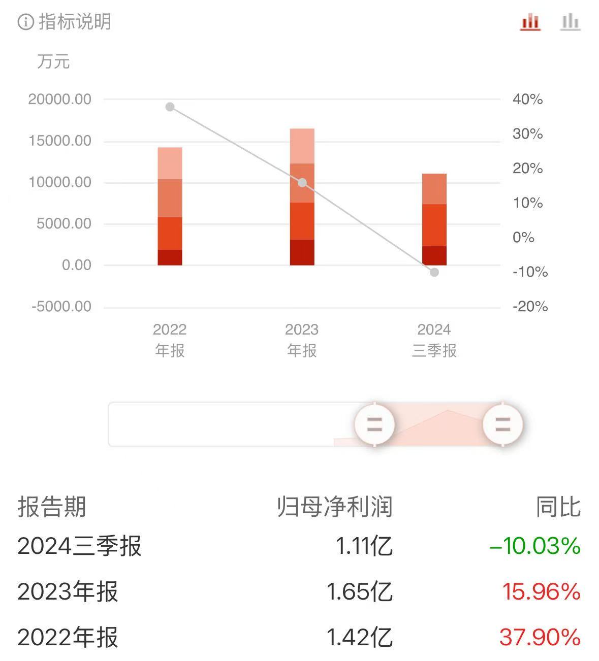业绩方面,中汽股份2023年净利增速有所放缓,而来到2024年,其净利更是陷入了下滑。财务数据显示,2024年前三季度,公司实现营业收入2.73亿元,同比增长4.52%;归母净利润1.11亿元,同比下降10.03%;扣非净利润9700.11万元,同比下降8.15%。