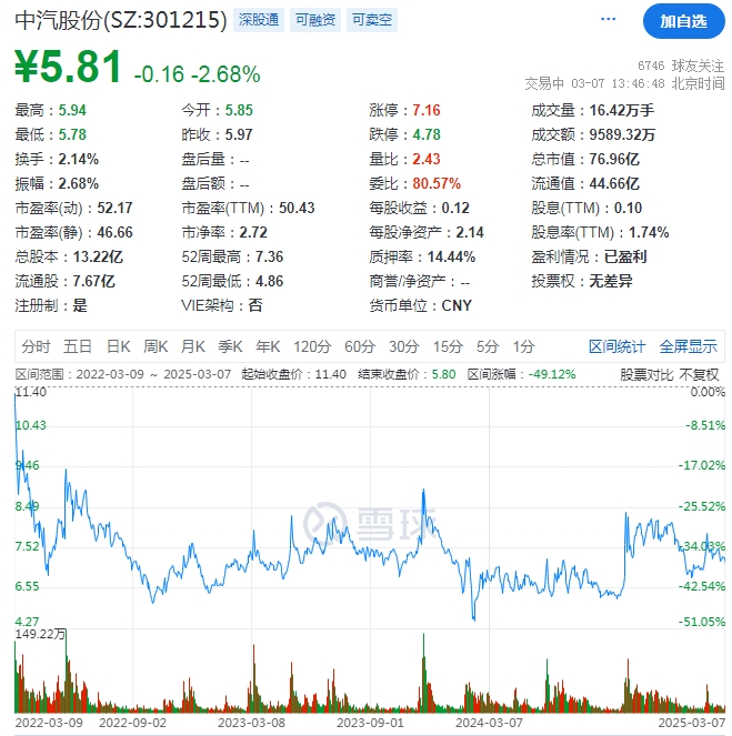 2022年3月8日,中汽股份正式于深交所创业板上市,成为A股汽车试验场领域第一股。上市首日,中汽股份股价暴涨,但次日便开始震荡下跌,从2022年3月9日至今,该股股价已接近“腰斩”。