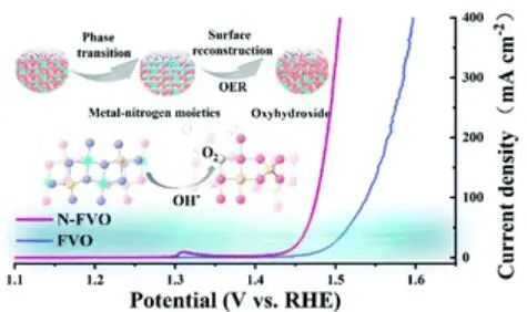 表面金属-氮基团结合了结构和电子特性的优势,有望用于电催化水氧化。基于此,宁夏大学马保军研究员和王薇讲师(共同通讯作者)等人报道了通过在Fe-V氧化物表面制造活性金属氮化物(FeN、Fe3N和VN)制备了一种高效的Fe-V基混合电催化剂(N-FVO)。
