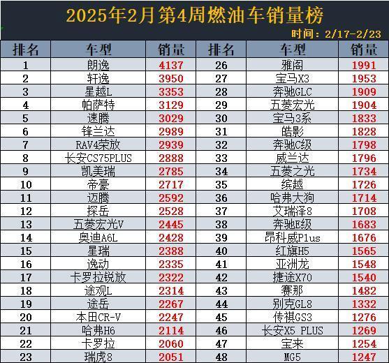 心酸啊,看到2月第4周的燃油车销量数据,真的让人忍不住感慨。就拿星越L来说吧,在之前的销量排名里表现不错,可这一周却丢了冠军的宝座。还有速腾呢,它只排在了第5名,这对之前在大家心中地位还不错的速腾来说,也像是一个不小的冲击。更让人惊讶的是哈弗H6,曾经那可是神车般的存在啊,这周竟然只排到了第21名。这一个个名字背后,可都是汽车爱好者和车主们的期待与关注啊。