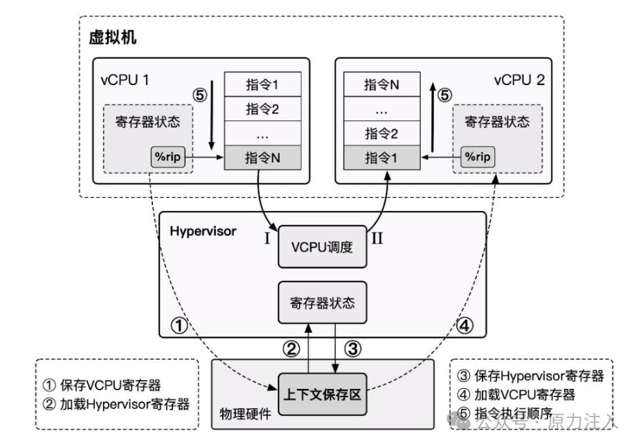 Hypervisor 具备最高权限,而 Guest VM 则处于较低权限。在硬件层面上,Guest VM 直接执行非敏感指令。当涉及敏感操作时,Guest VM 会被引导至拥有最高权限的 Hypervisor,从而由 Hypervisor 模拟并处理敏感指令。在进行虚拟CPU调度时,我们先保存当前vCPU的状态。然后,恢复Hypervisor的状态,让它继续执行其任务。完成后,Hypervisor将开始下一轮的虚拟CPU调度,恢复下一个vCPU的状态并重新开始执行。