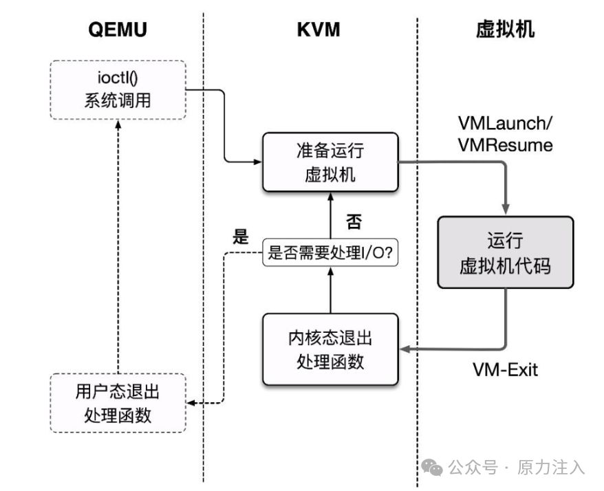 在 VM-Exit 产生时,KVM 接管并分析原因,决定是继续运行还是交由 QEMU 处理。