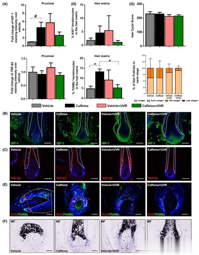 咖啡因或UVR对毛发周期相关参数有不同影响