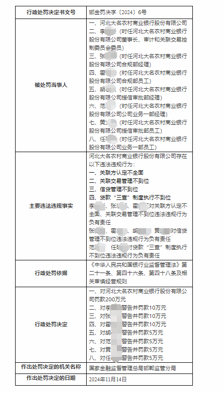 文号:“邯金罚决字〔2024〕6号”的行政处罚判决书显示:河北大名农商银行因关联方认定不全面、关联交易管理不到位、信贷管理不到位、贷款“三查”制度执行不到位被罚款200万元。李某某、张某某、霍某某对关联方认定不全面、关联交易管理不到位违法违规行为负有责任;张某某、霍某某、胡某某、黄某某对信贷管理不到位违法违规行为负有责任;范某某、任某某对贷款“三查”制度执行不到位违法违规行为负有责任。邯郸监管分局分别对李某某、张某某、霍某某警告并罚款10万元,对胡某某、范某某、黄某某、任某某警告并罚款5万元。详细内容如下: